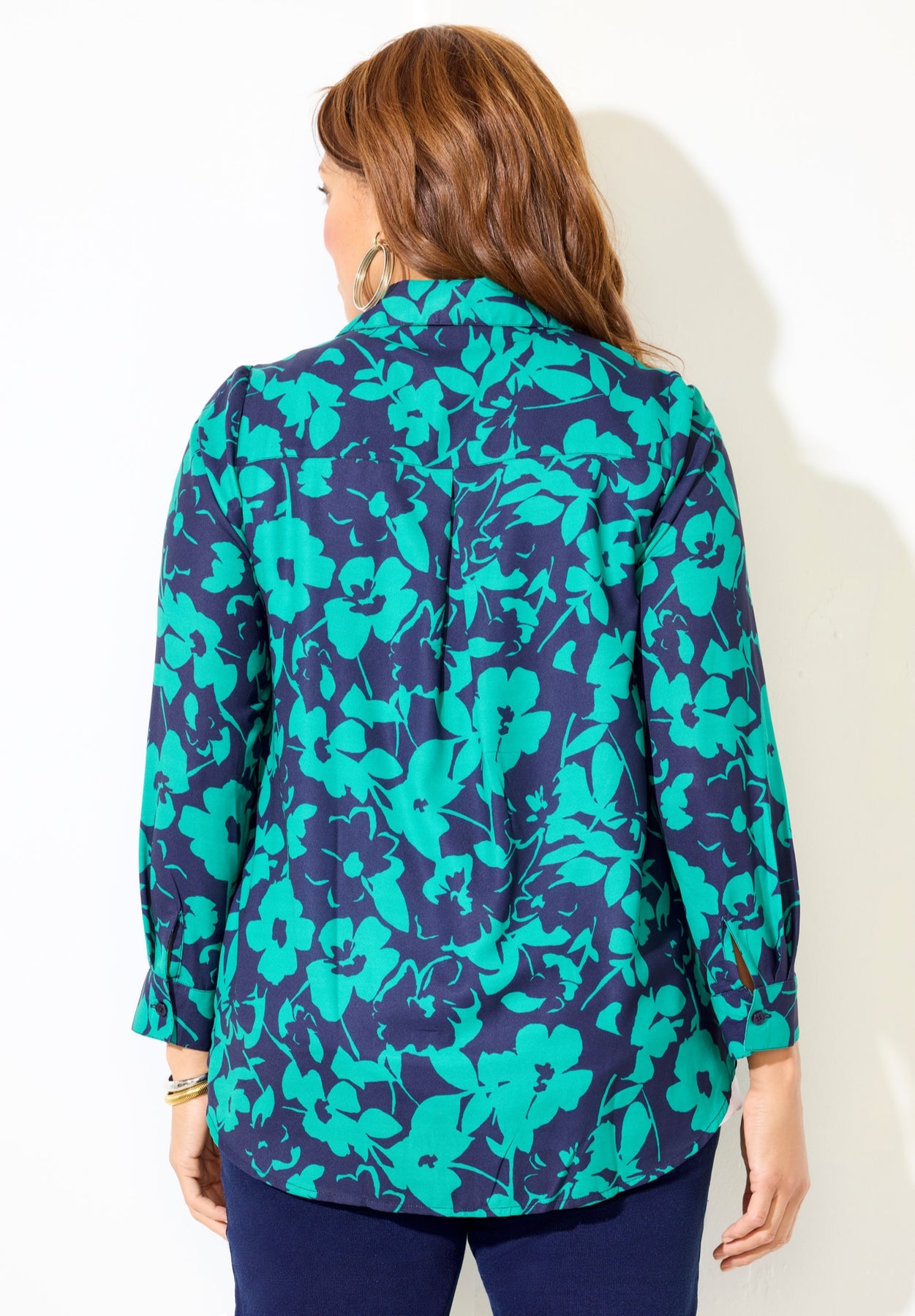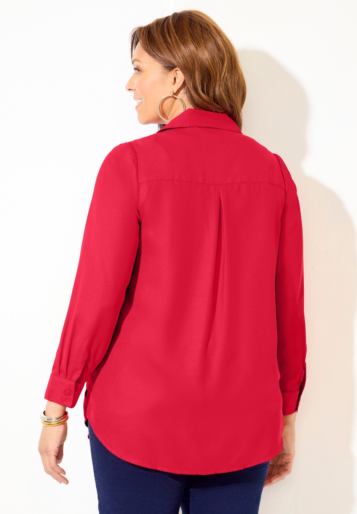 FIT: Relaxed, easy fit. V-neckline shirt collar, buttonfront, button-cuff long sleeves, flap patch chest pockets, and side slits at high-low shirt tail hem. Shirring detail.