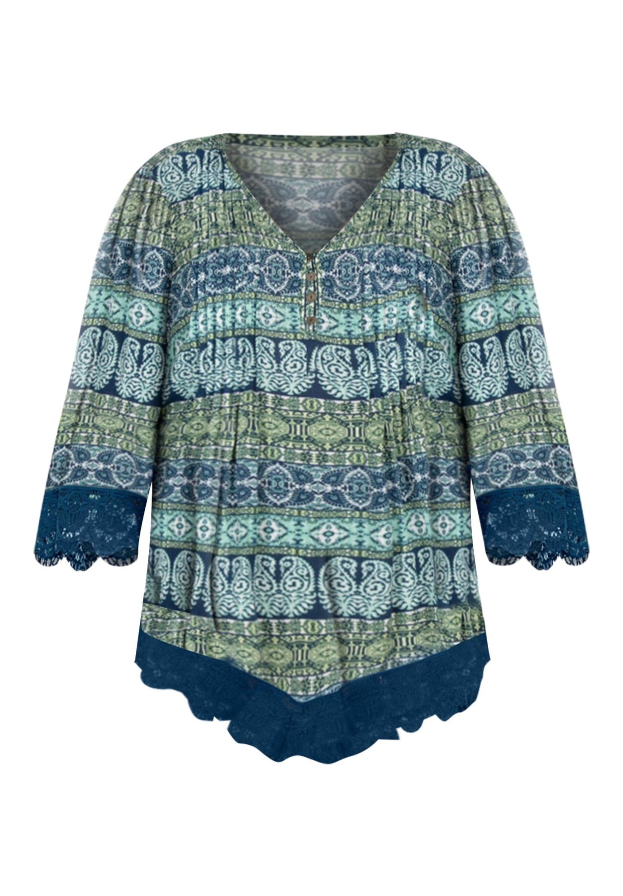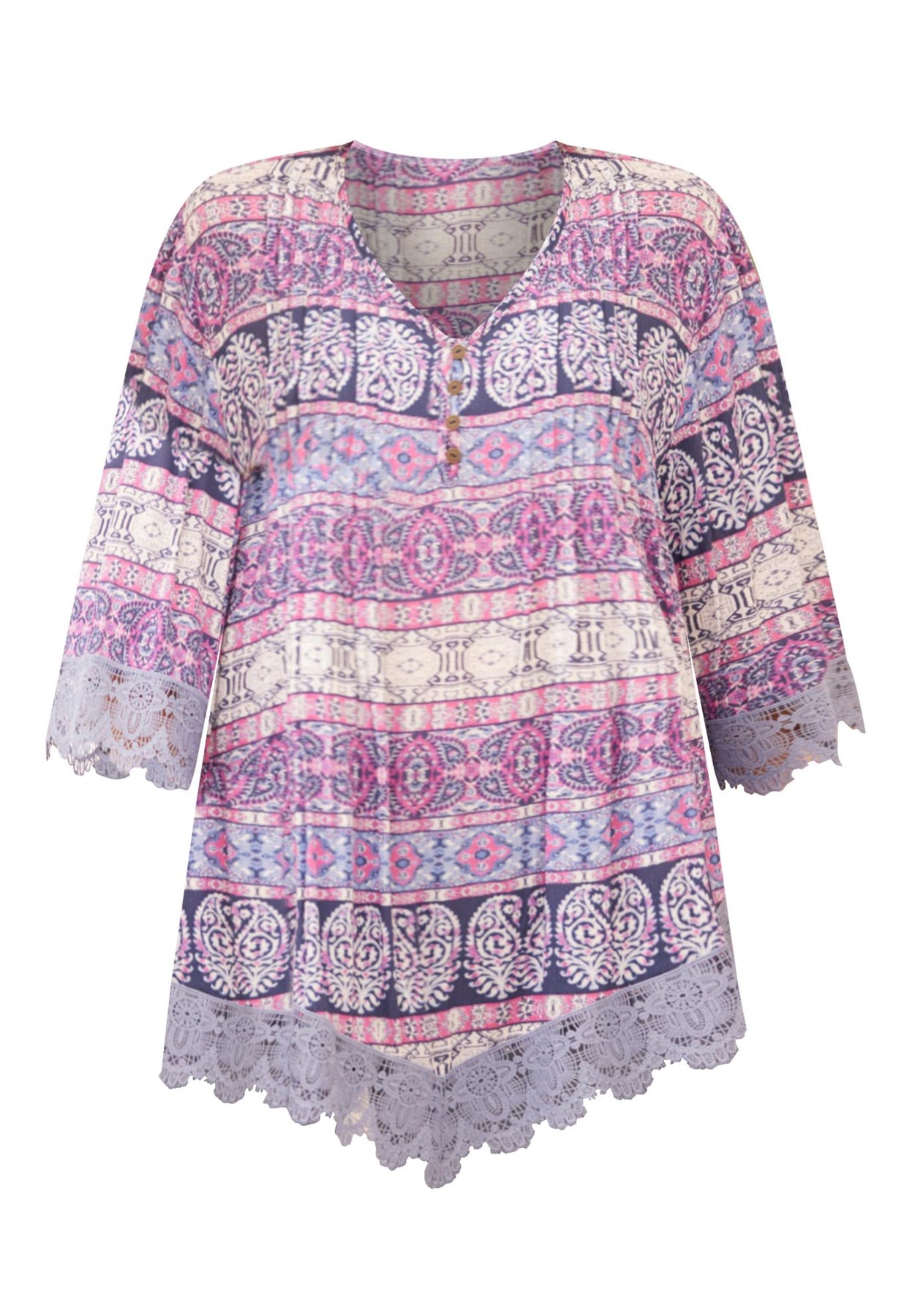 FIT: Relaxed and easy pullover blouse. V-neckline with button placket and pintuck details. Lace trim at 3/4 sleeves and front hem. Hemline dips to a point in front, straight in back.