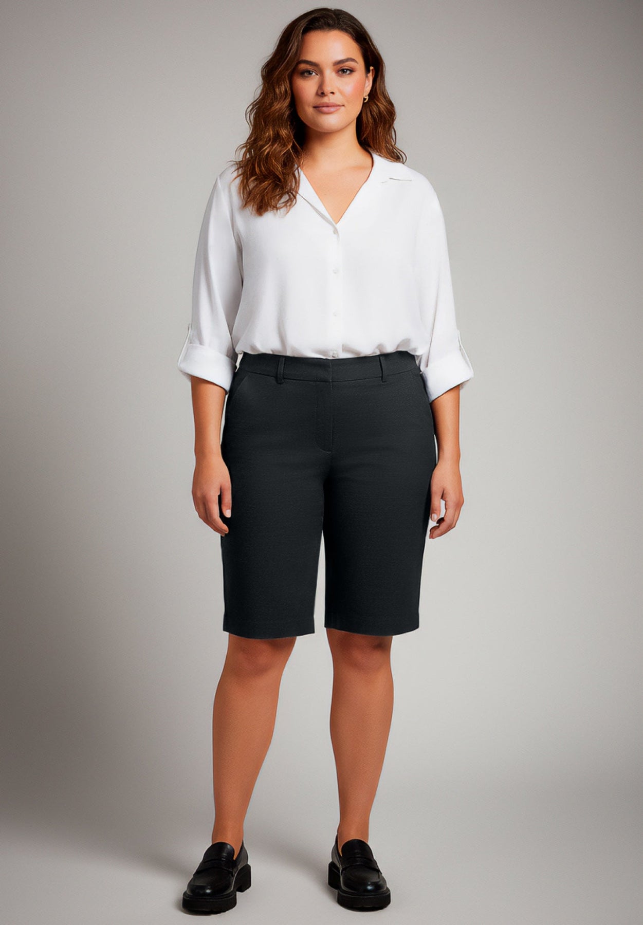 These super-stretch pull-on shorts feature a smooth, easy fit with a clean, streamlined silhouette. Designed with a comfortable waistband and faux pocket detailing, they offer flexibility and a polished look without sacrificing comfort. Perfect for everyday wear, they move effortlessly from casual outings to relaxed days at home.