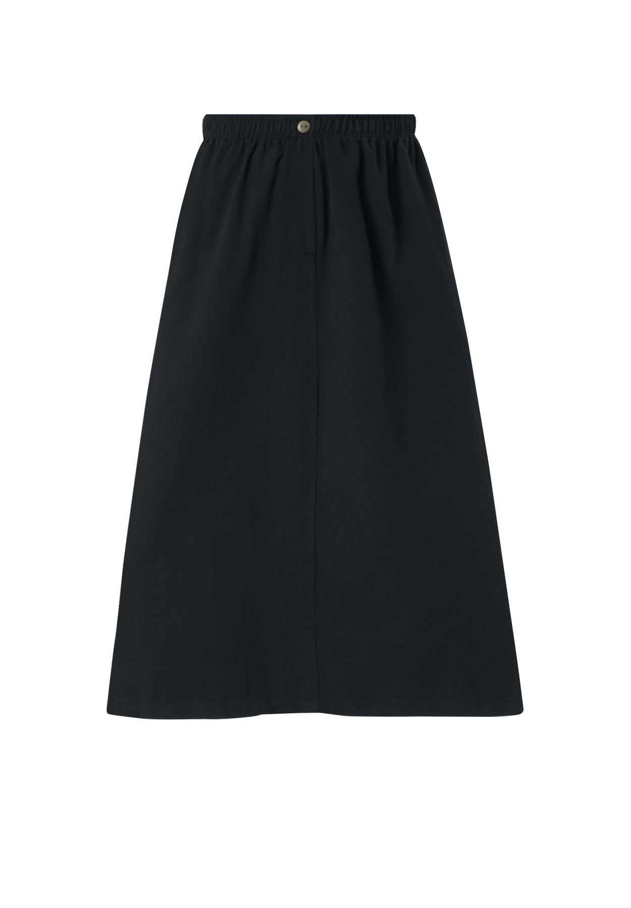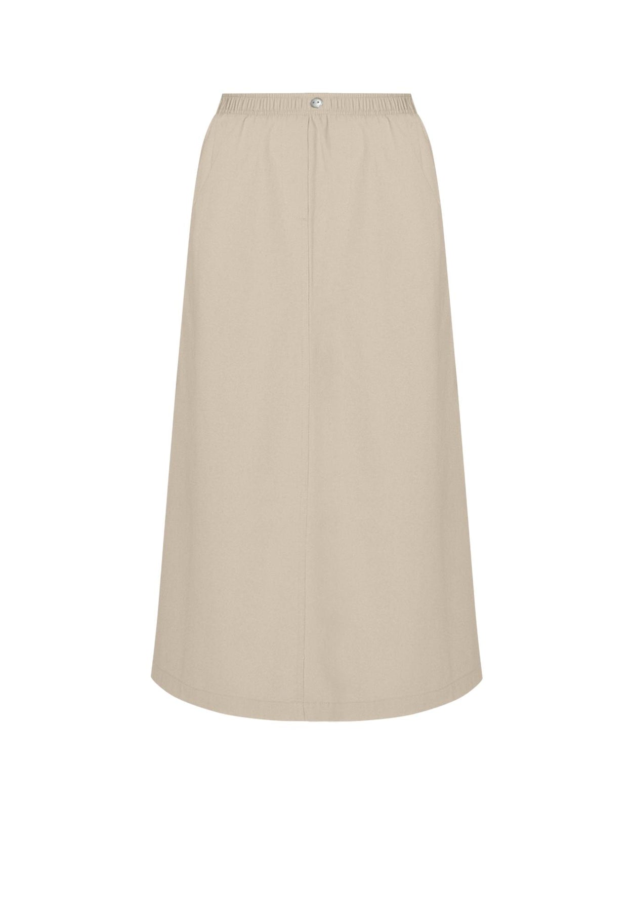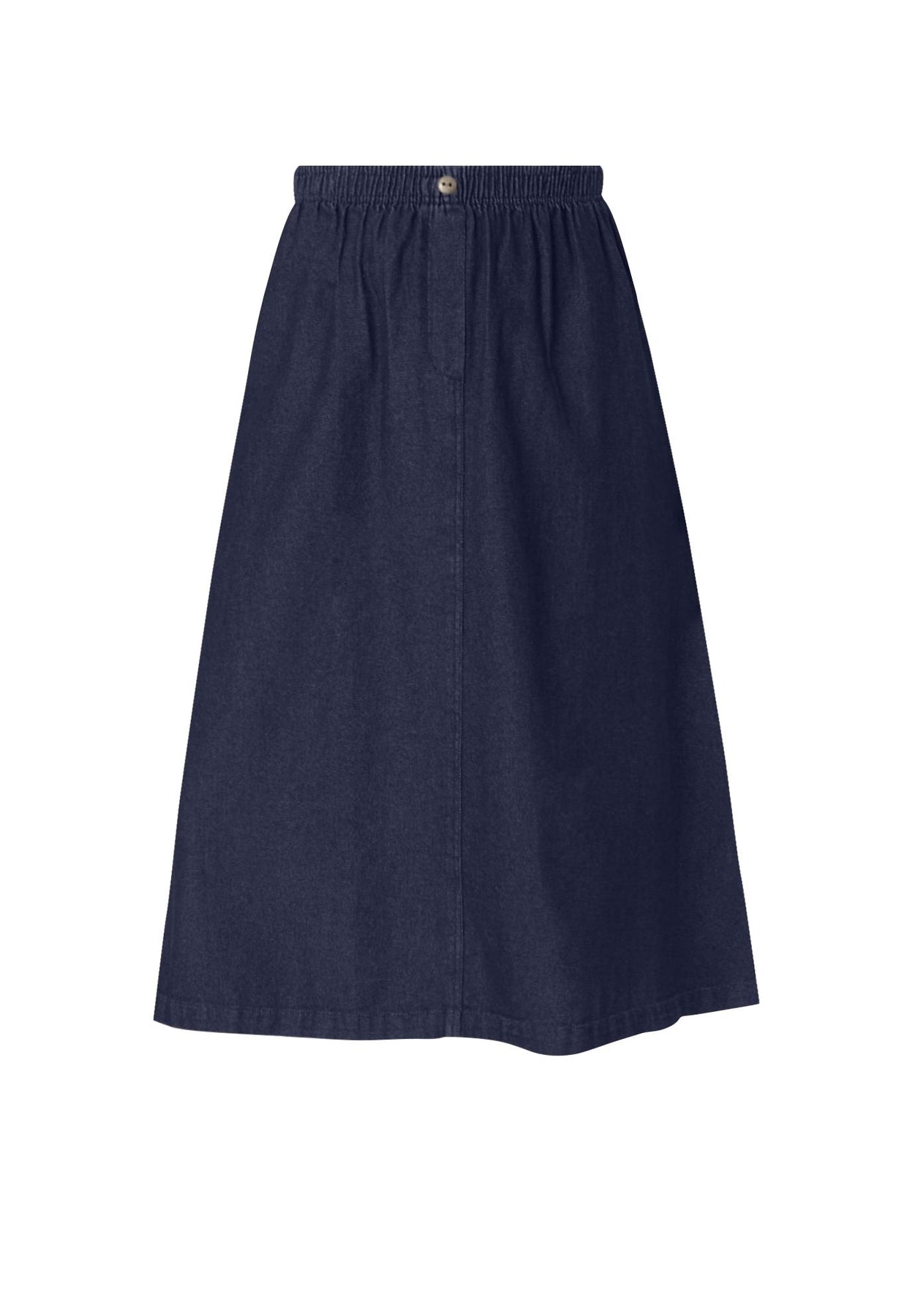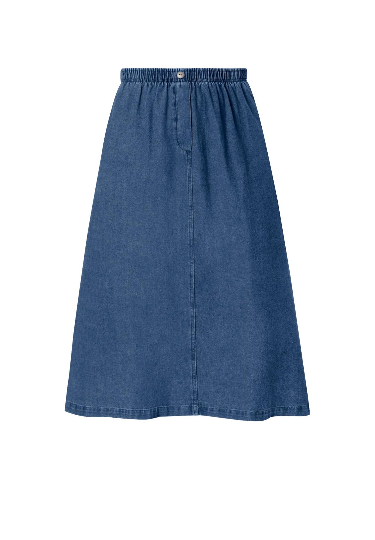 Pull-on ease meets versatile, classic style. Our all-cotton denim 7-Day jeans skirt has a comfortable full covered elastic waistband and relaxed, A-line silhouette. Front mock fly and button. Non-stretch 100% cotton gives you a custom-feeling fit that grows softer with every washing.
