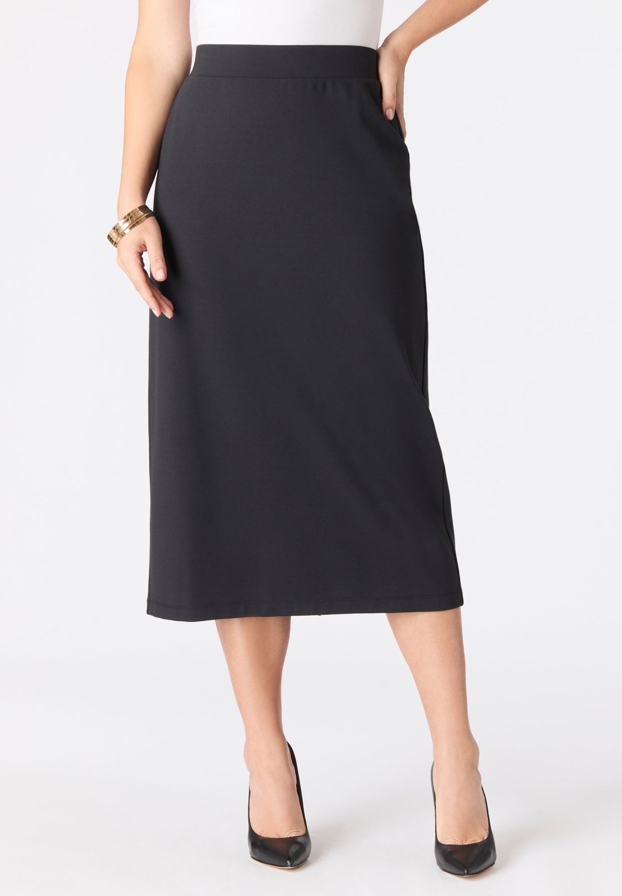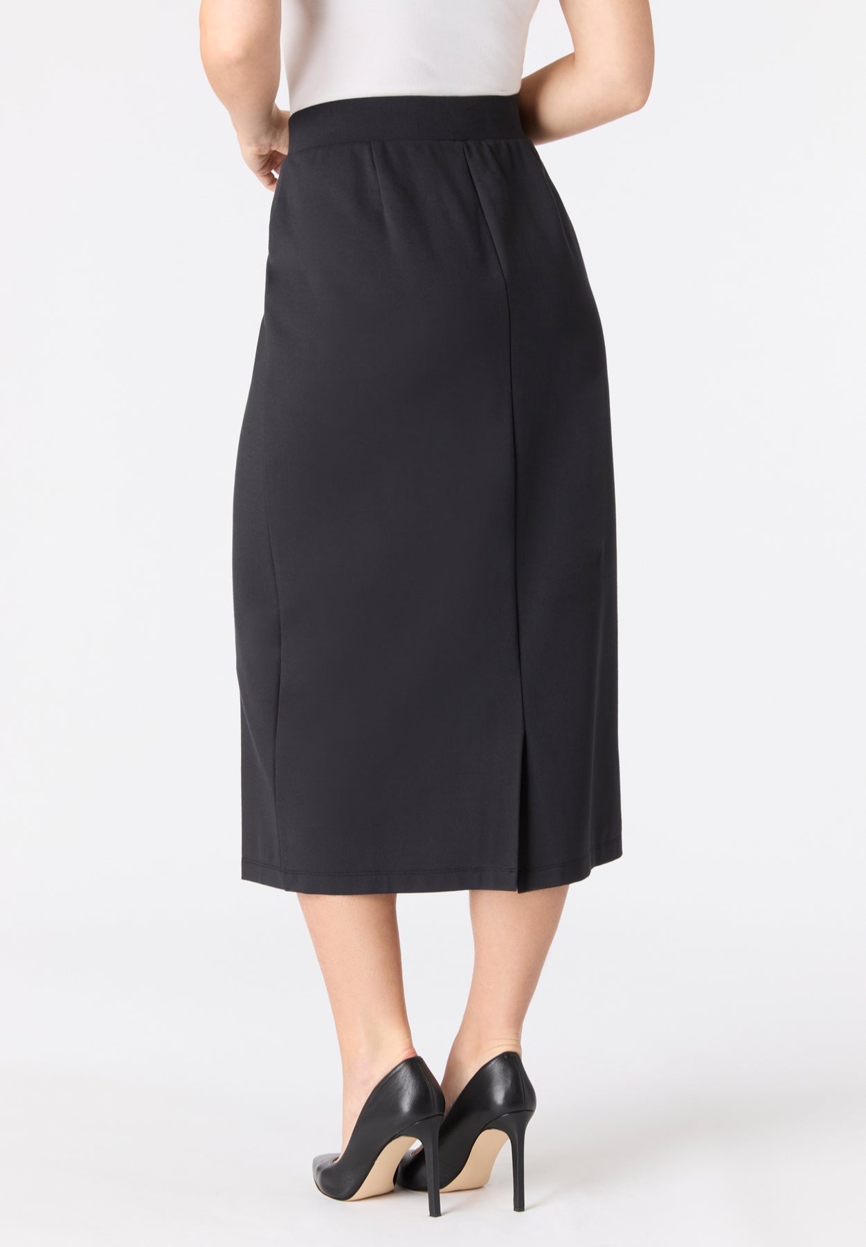 This pencil skirt offers a sleek midi silhouette with a flat, elastic waistband, subtle shaping darts, and a back vent for ease and polish. It's a figure-loving fit and a timeless staple for appointments, dinner parties or nights out.