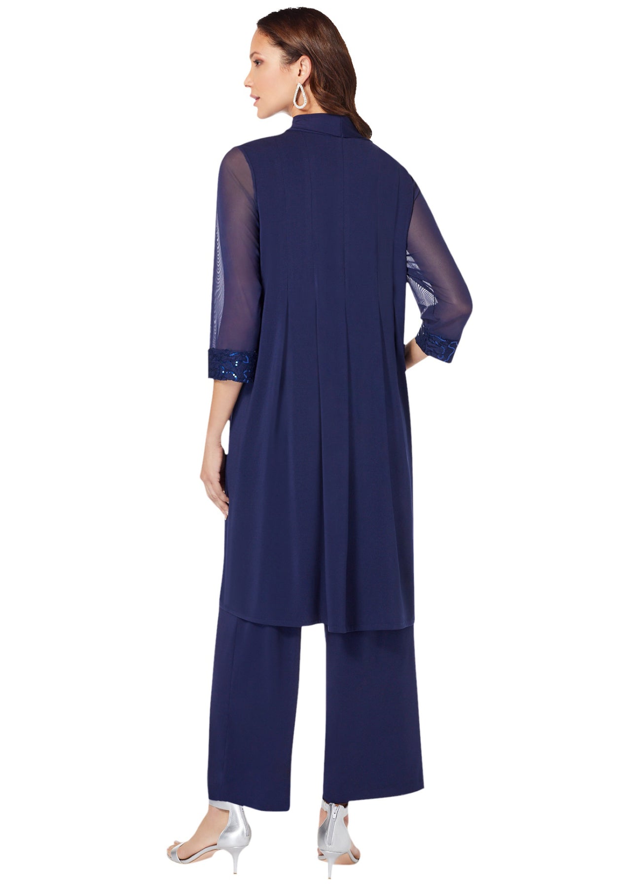 This timeless set makes an elegant, going-out statement. The duster jacket features an open front, sheer three-quarter sleeves and sequin cuffs. Allover lace top with a feminine square neck and squareneck sleeveless top with jersey knit back. Elasticized wide-leg pant.