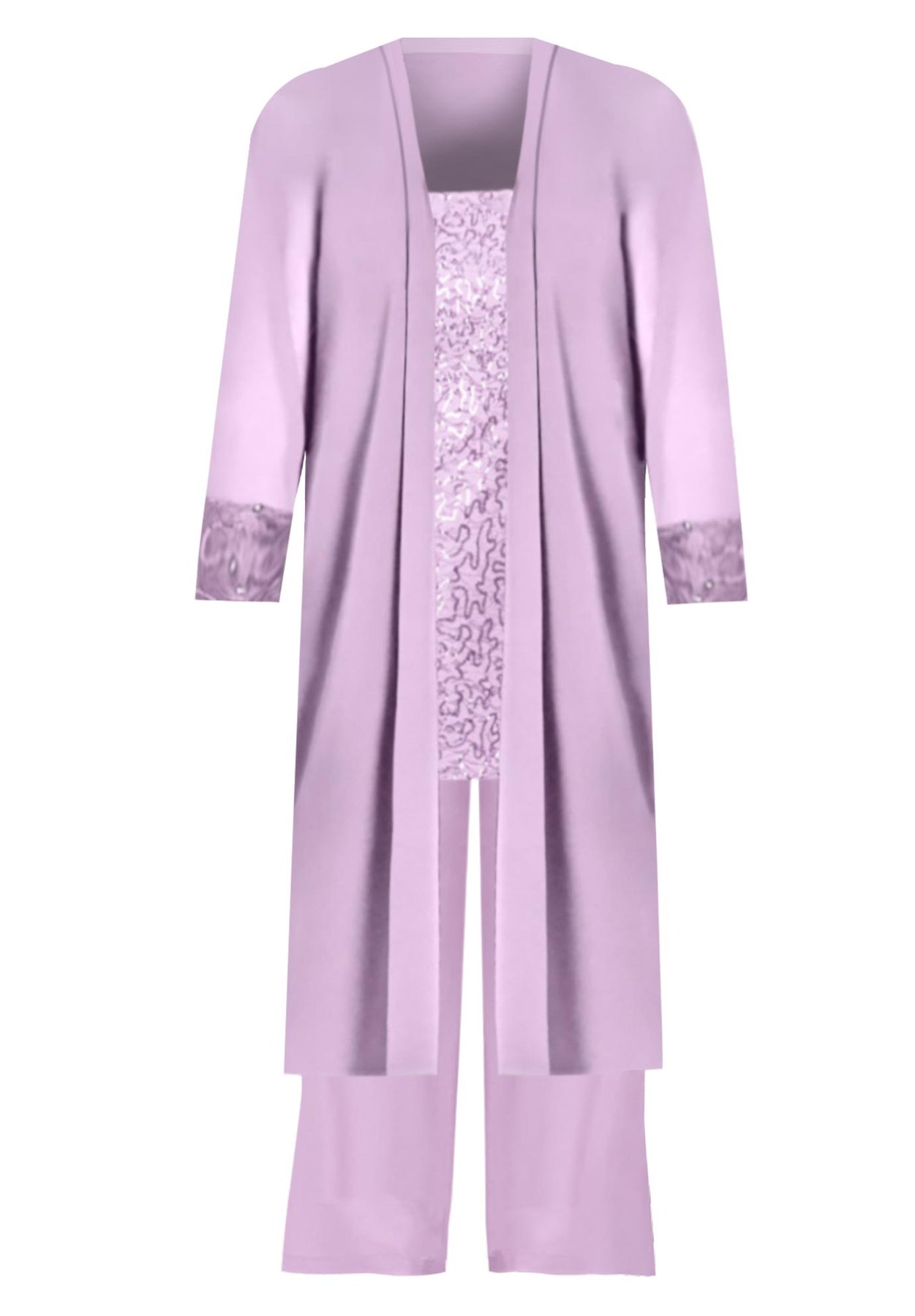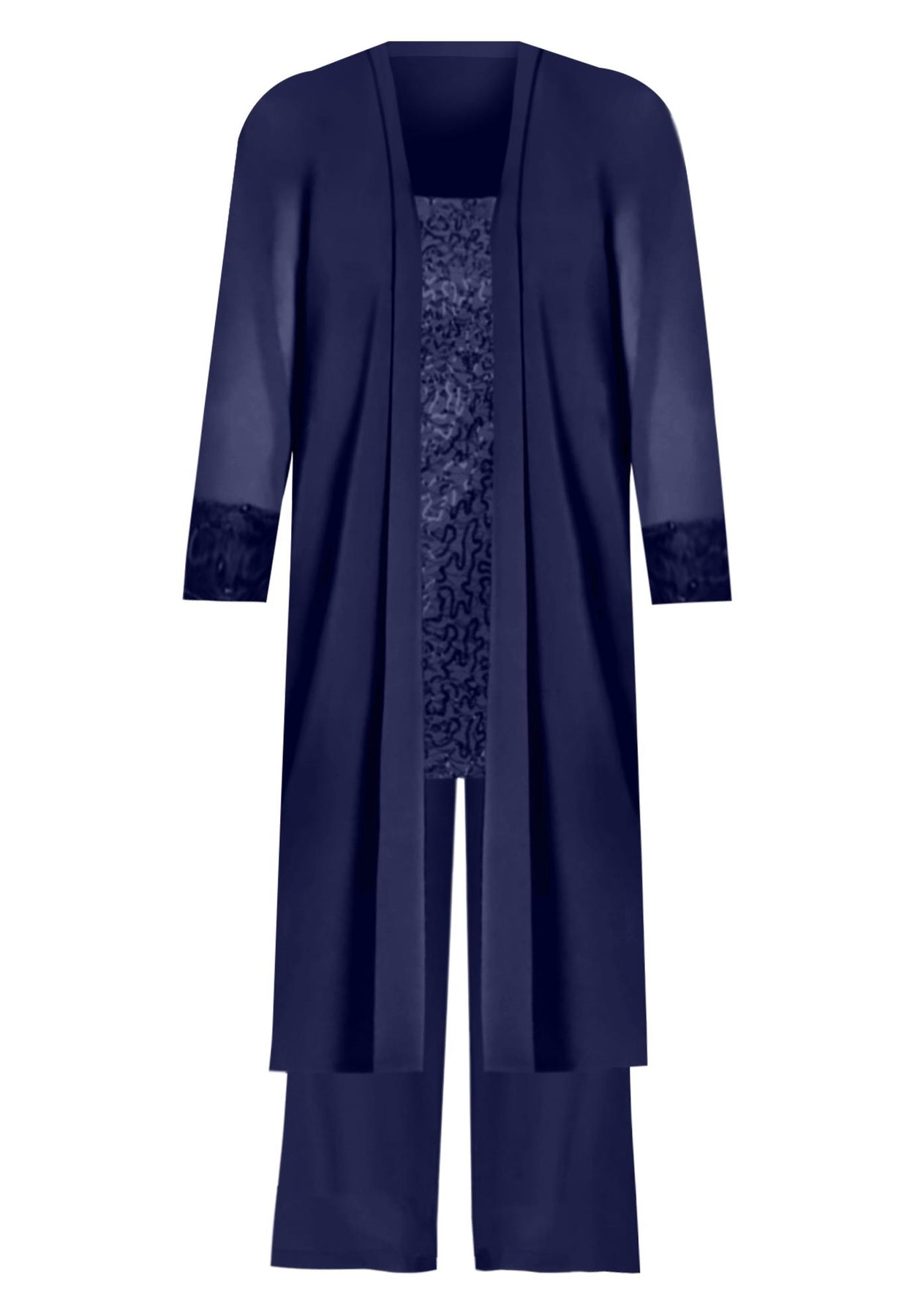 This timeless set makes an elegant, going-out statement. The duster jacket features an open front, sheer three-quarter sleeves and sequin cuffs. Allover lace top with a feminine square neck and squareneck sleeveless top with jersey knit back. Elasticized wide-leg pant.