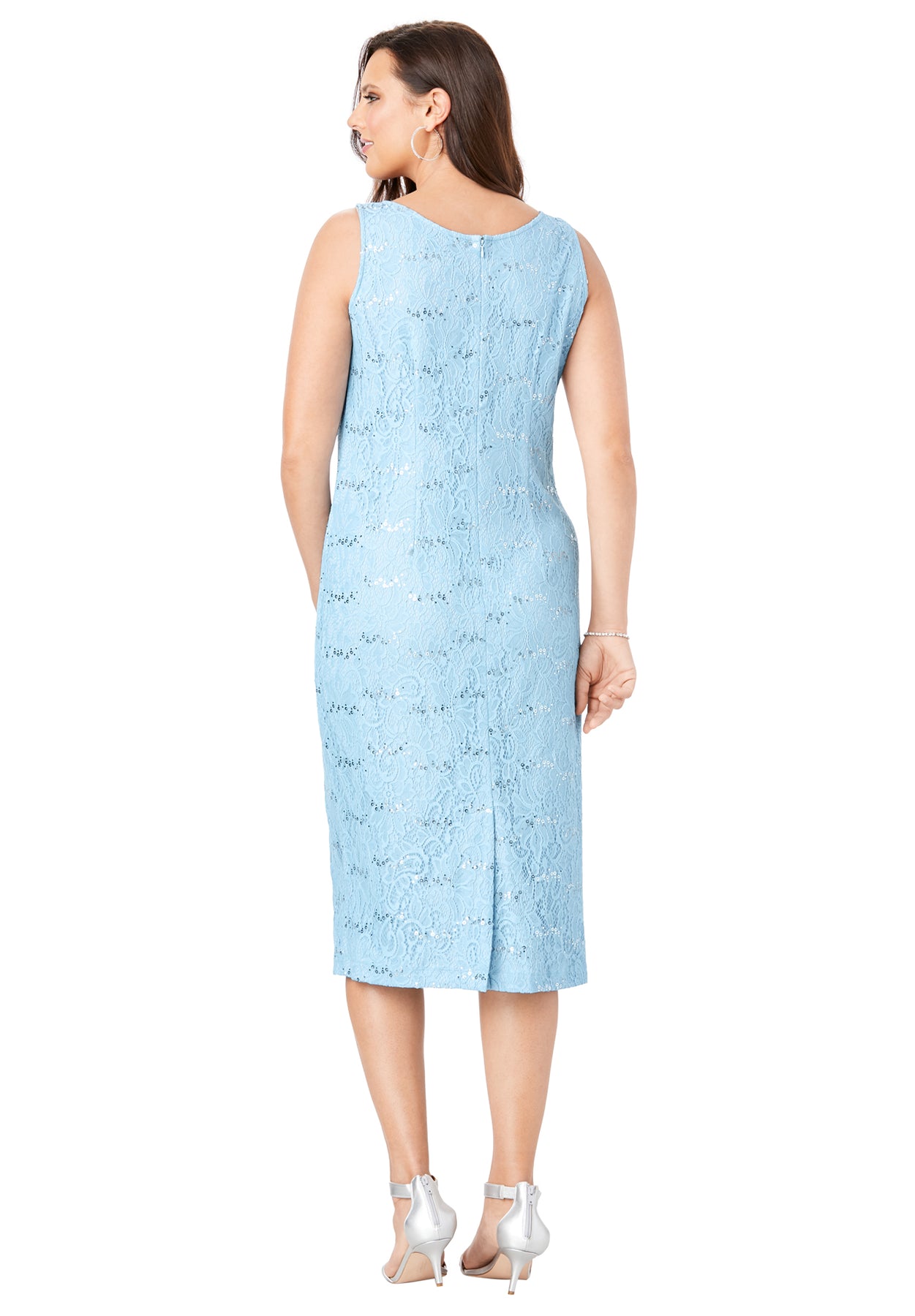 Elegance and style come together in this gorgeous dress and jacket set crafted in sequin-embellished stretch lace for a stunning effect. Sleeveless, fully lined dress with back zip. Flyaway, unlined jacket with three-quarter sleeves.