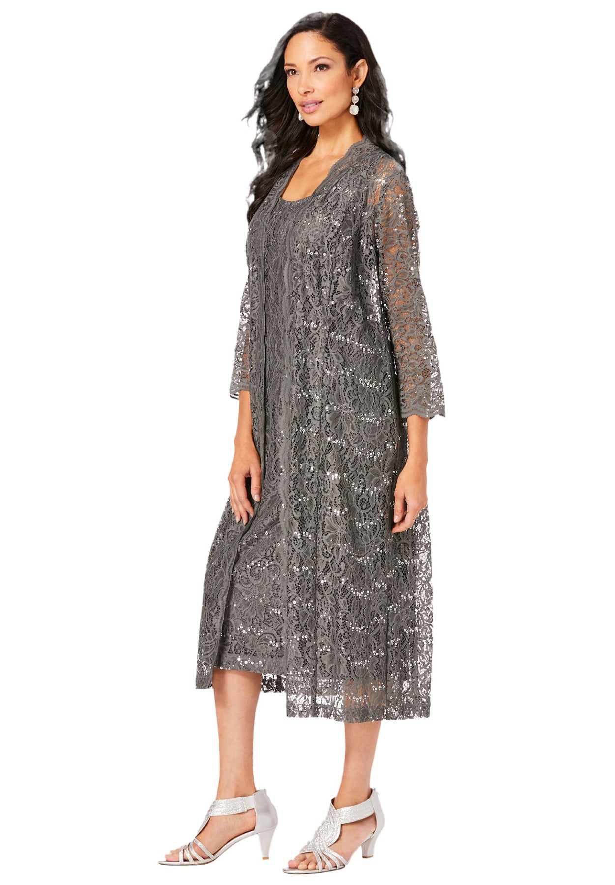 Elegance and style come together in this gorgeous dress and jacket set crafted in sequin-embellished stretch lace for a stunning effect. Sleeveless, fully lined dress with back zip. Flyaway, unlined jacket with three-quarter sleeves.