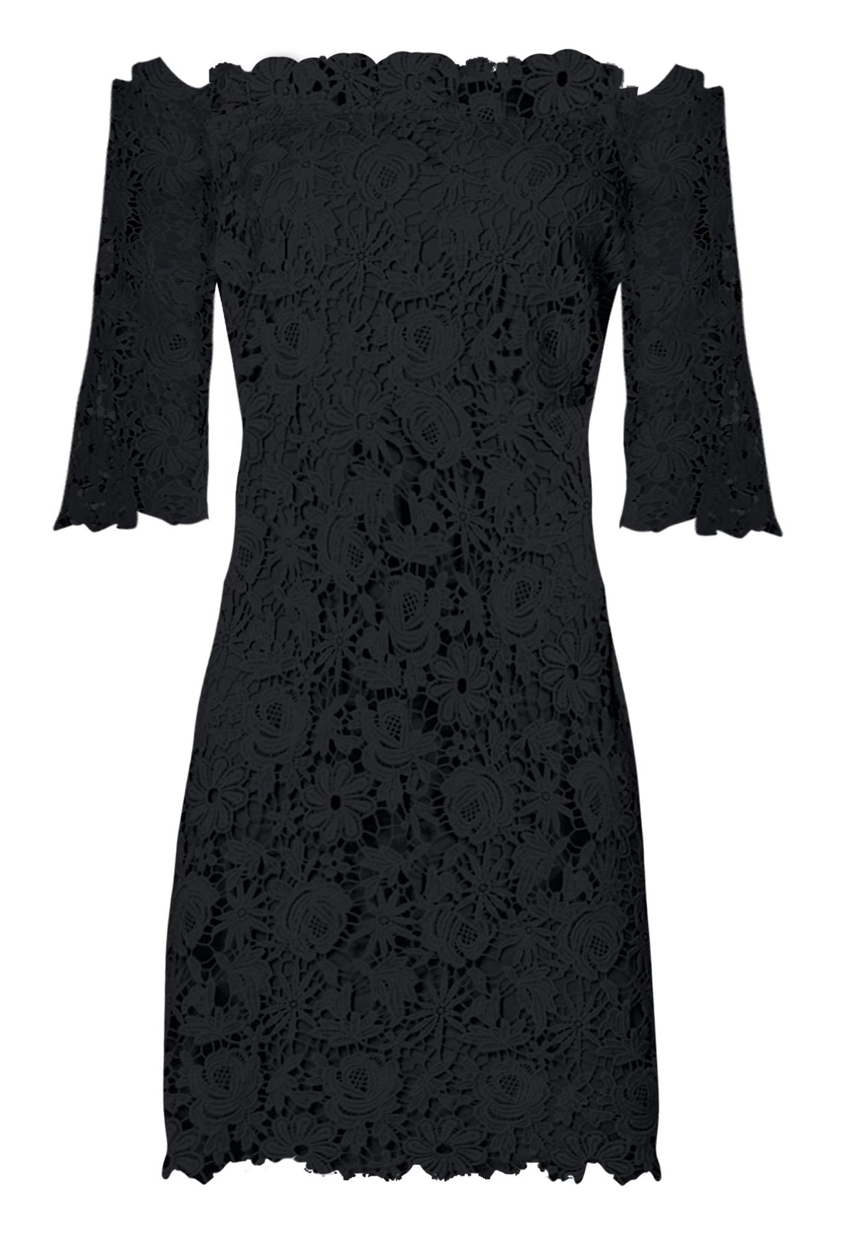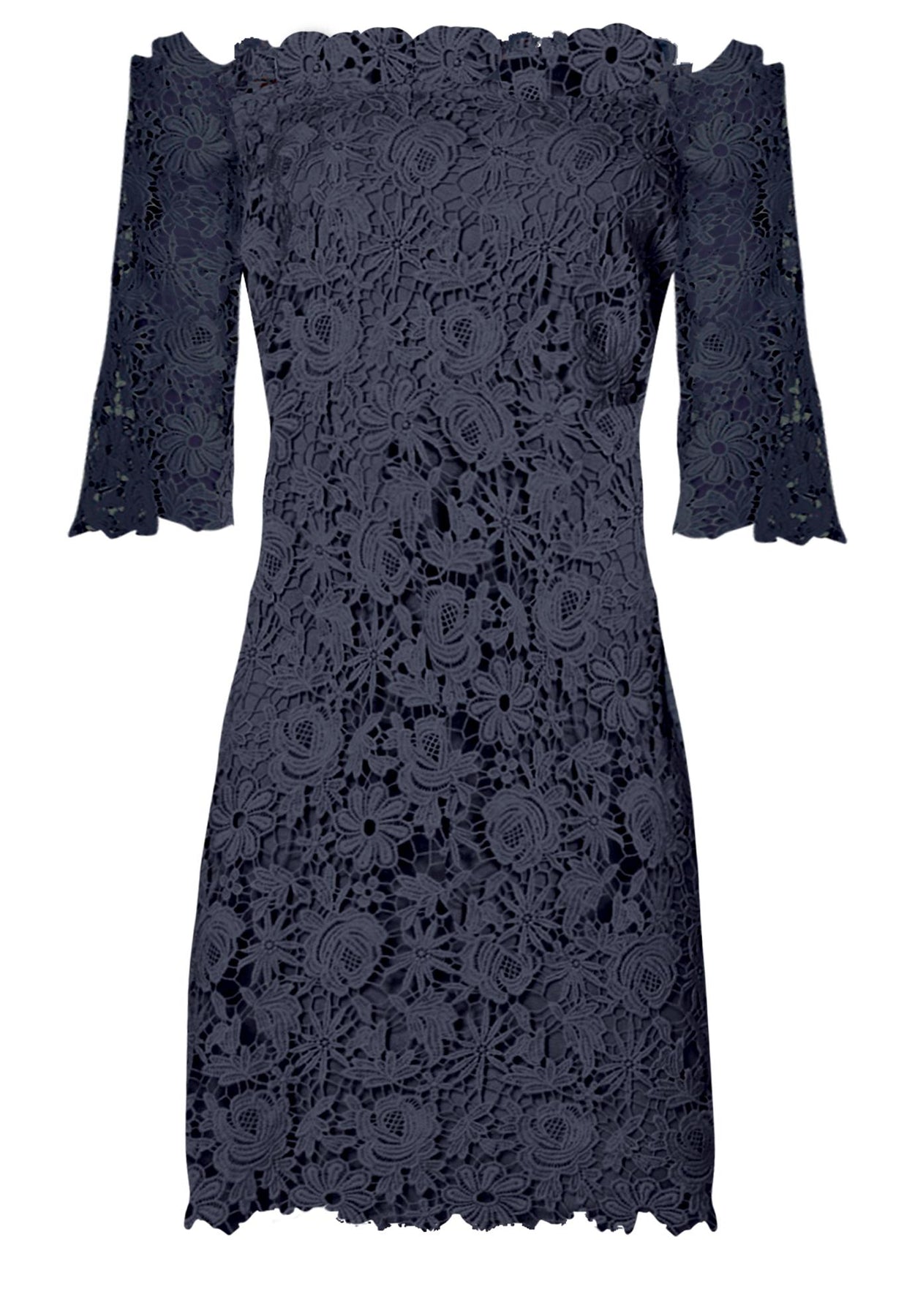 Look great from every angle in this charming allover lace dress featuring so-pretty scalloped edging. Elasticized neckline, three-quarter bell sleeves. Fully lined body.