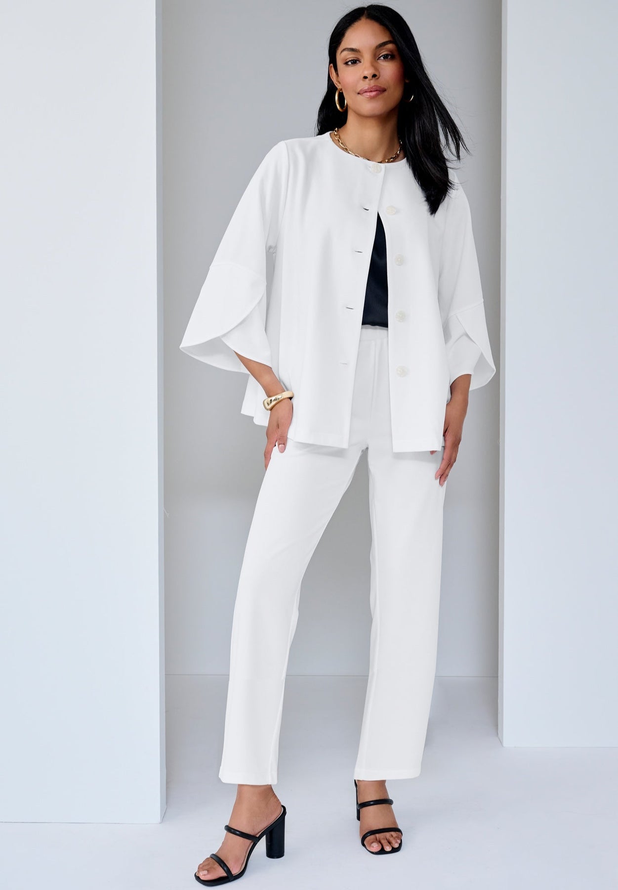 Instant office outfits are easier than ever with the Jessica London plus size women’s Stretch Knit Crepe Bell Sleeve 2-Piece Set. The comfortable, lightweight stretch knit fabric gives this set an endlessly sophisticated look and feel.