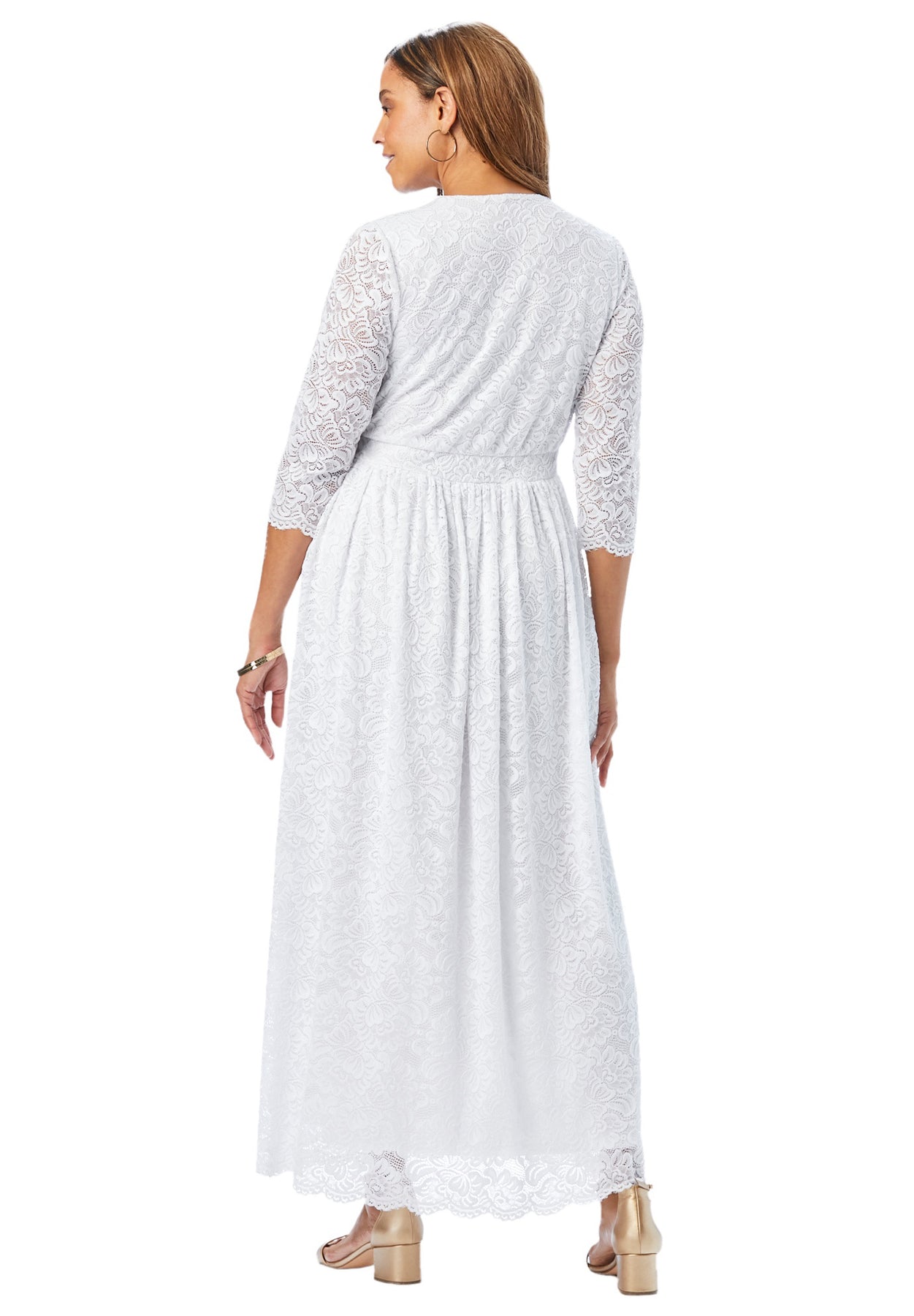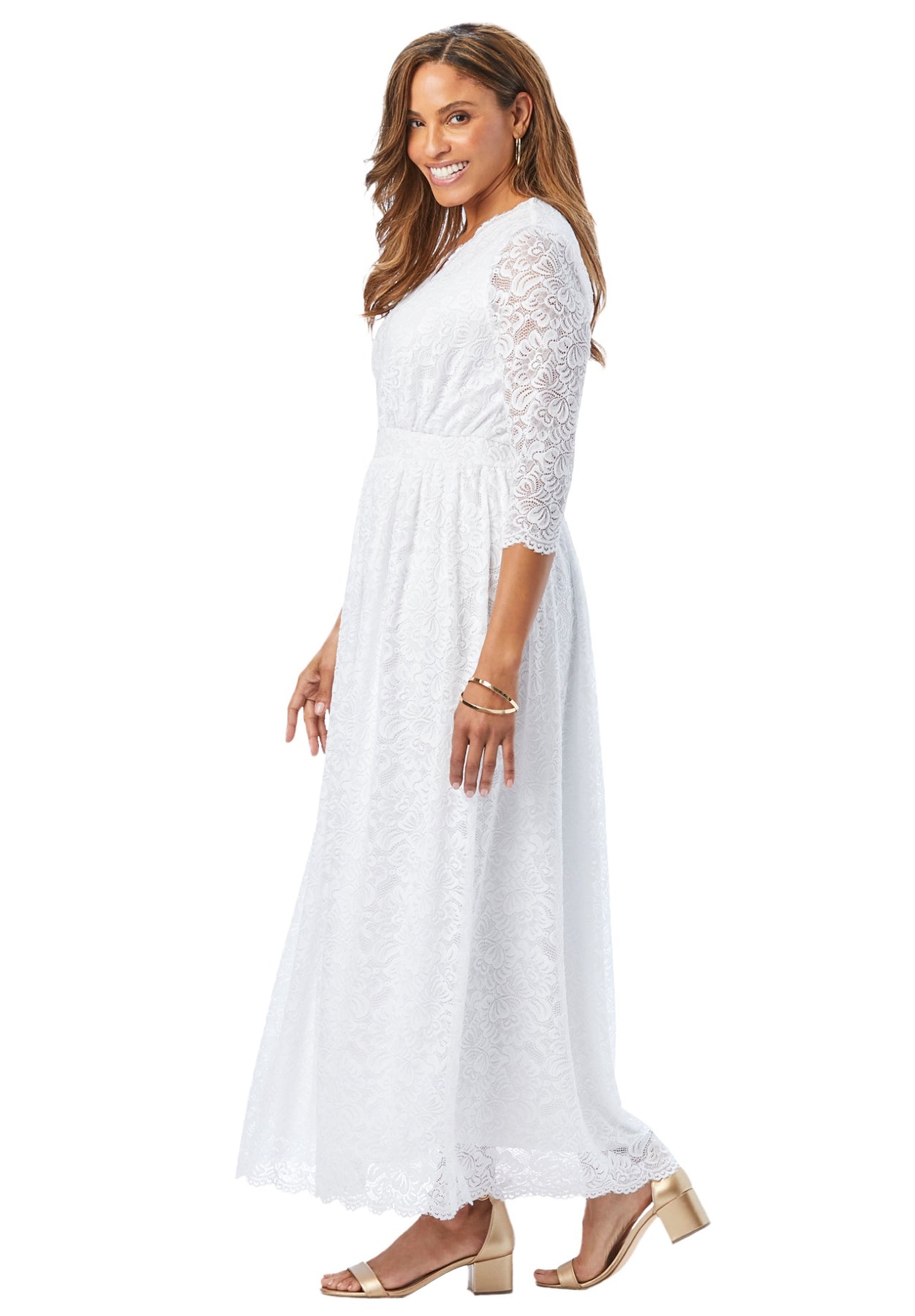 Dance the night away in the entrance-making Jessica London women's plus size easy-care Stretch Lace Maxi Dress! Features a universally-flattering A-line fit and feminine scalloped edges on the hem and sleeves.