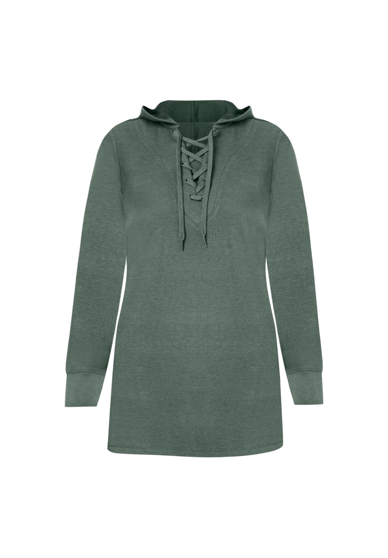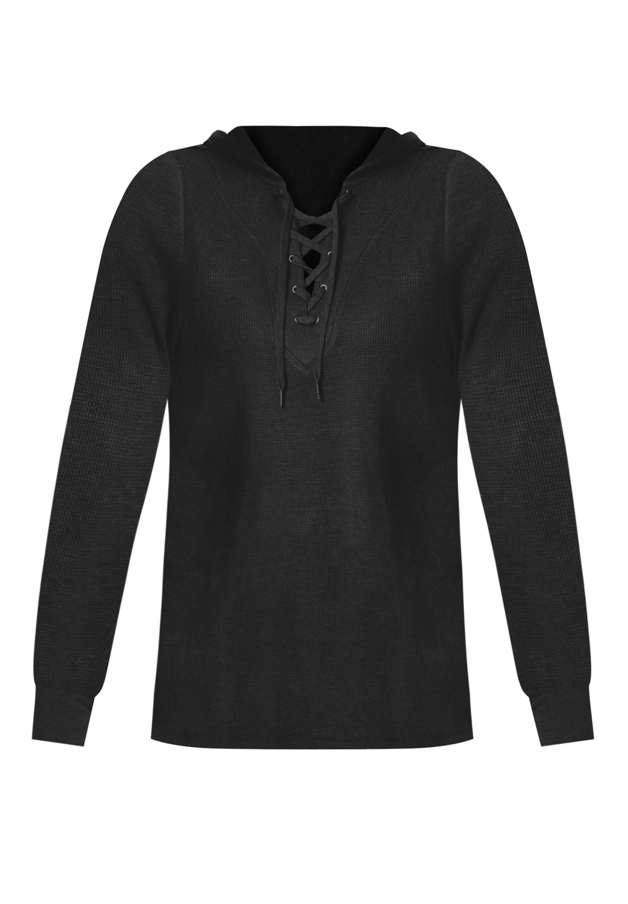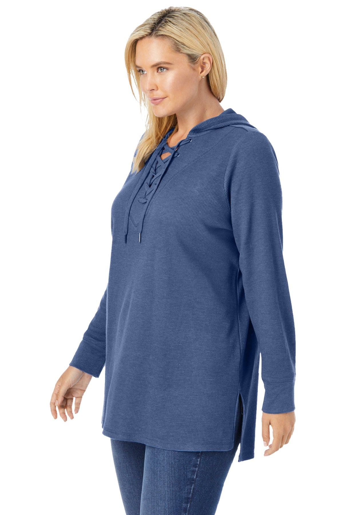 This comfy hoodie is made in textured thermal fabric that will keep you nice and cozy. A lace-up front is a fun accent that makes this more than just a basic sweatshirt.