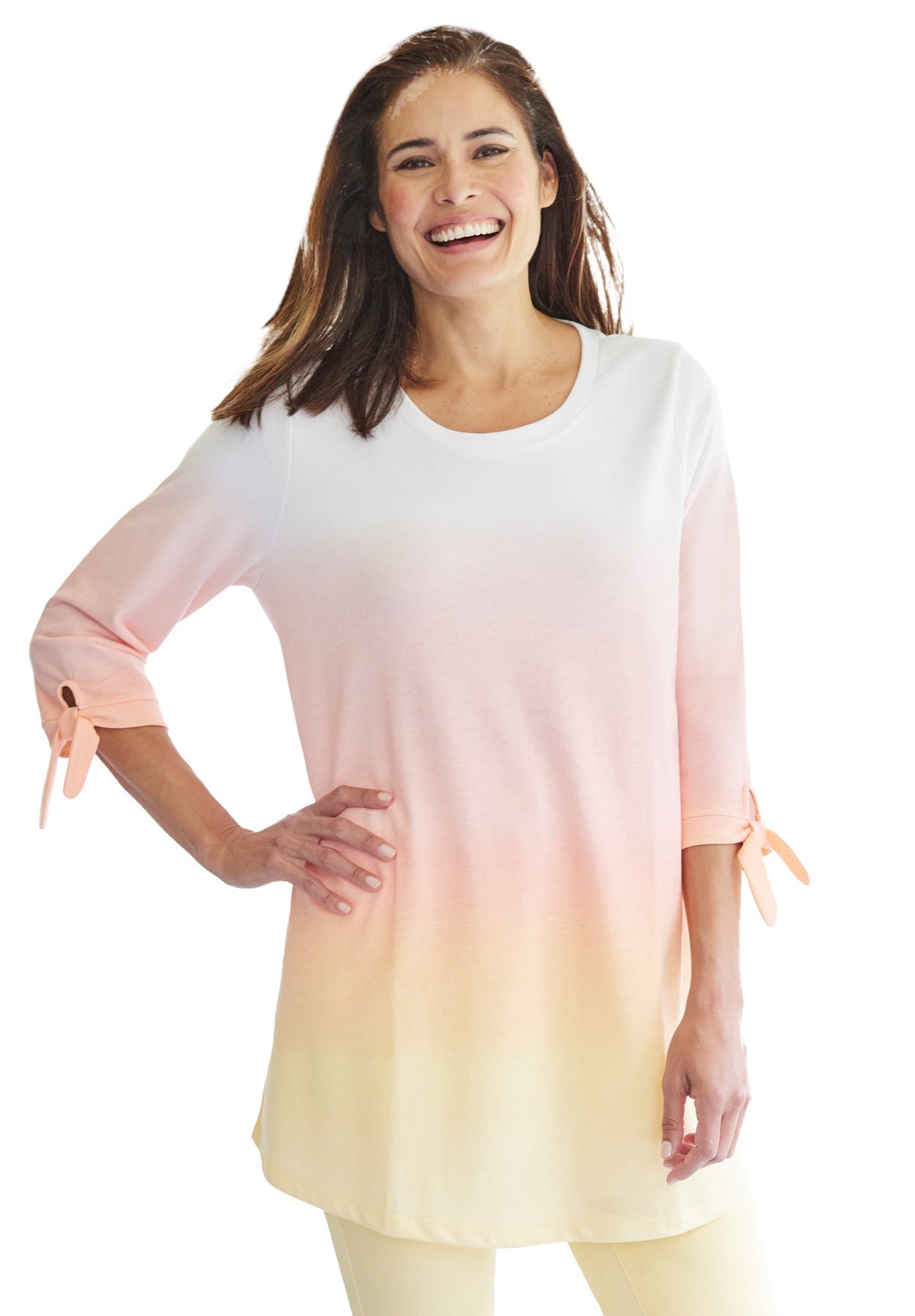 This pullover sweatshirt with a comfortable scoop neck is accented with self ties on the three-quarter sleeves. Made in a longer tunic length with a curved hem that falls over the hips, you'll love how cozy this easy French terry style is.