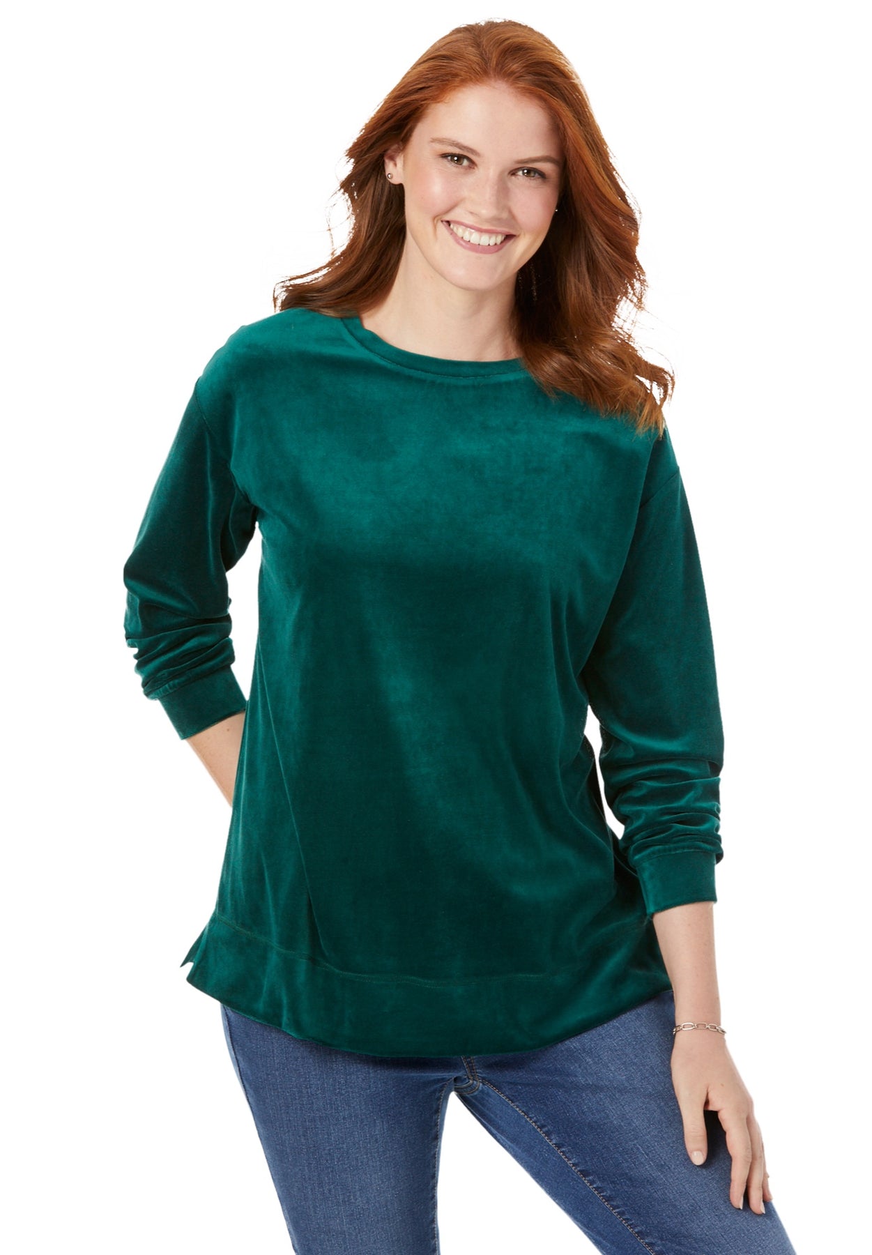 The plush velour of this tunic-length sweatshirt feels so soft and amazing. A great addition to your everyday pieces, we love it paired with casual separates. The velvety feel will make this your new go-to when you want style and comfort.