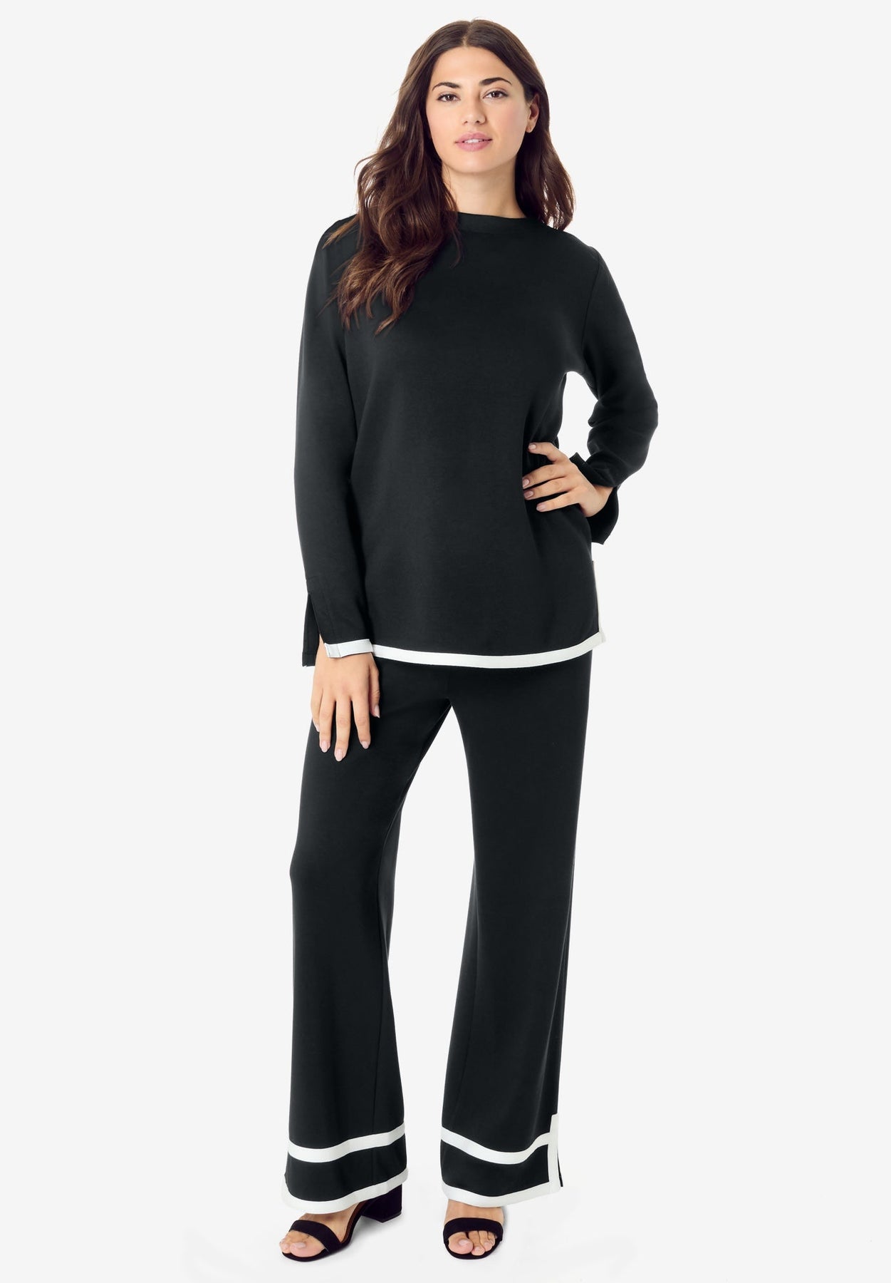 Coordinate and look great from head to toe with this lounge set. The color-blocked trim offers eye-catching contrast and understated style to its crewneck pullover and wide-leg pull-on pants. Side pockets.
