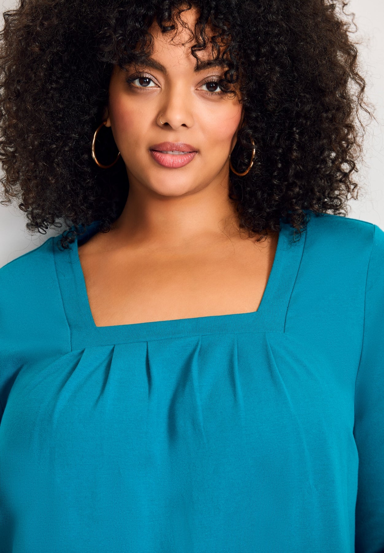 This long sleeve top features a modern square neckline with a banded edge that adds structure and visual interest. Gentle pleating along the front neckline creates soft draping and subtle texture, enhancing the relaxed silhouette. Designed for everyday wear, the fabric offers a comfortable and casual fit that moves easily with the body.