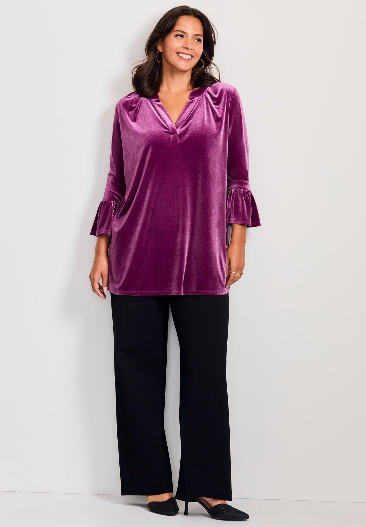 This top is features a plush velour fabric, giving it a soft texture and elegant drape. It features a split neckline with subtle ruching at the shoulders for added dimension. Flounced cuffs on the long sleeves add a feminine and stylish finishing touch.