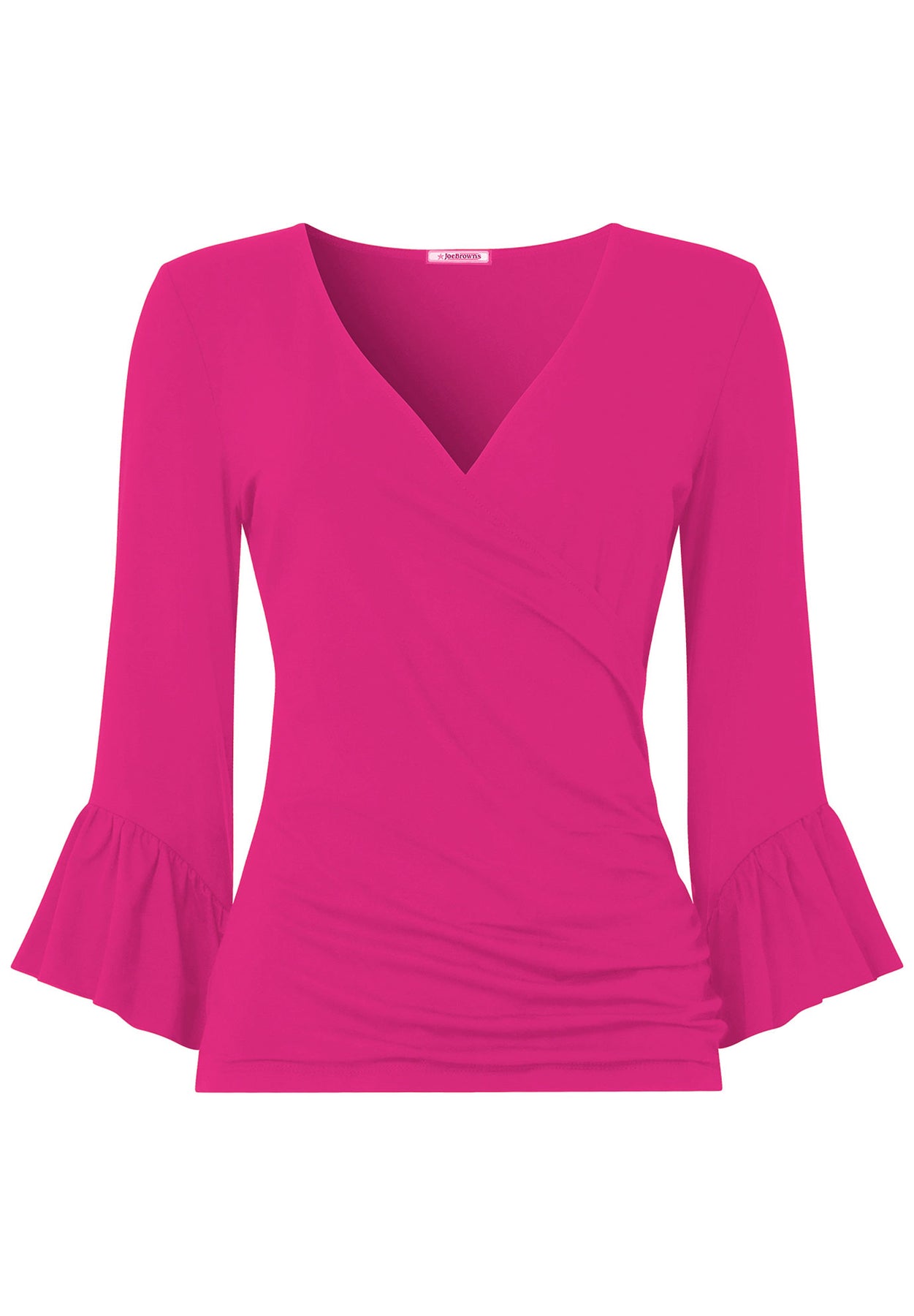 This V-neck jersey wrap top is designed to fit and flatter like never before. Its softness and ease of wear are complemented by flared sleeves and a gathered side seam, adding a subtle retro vibe that will turn heads.
