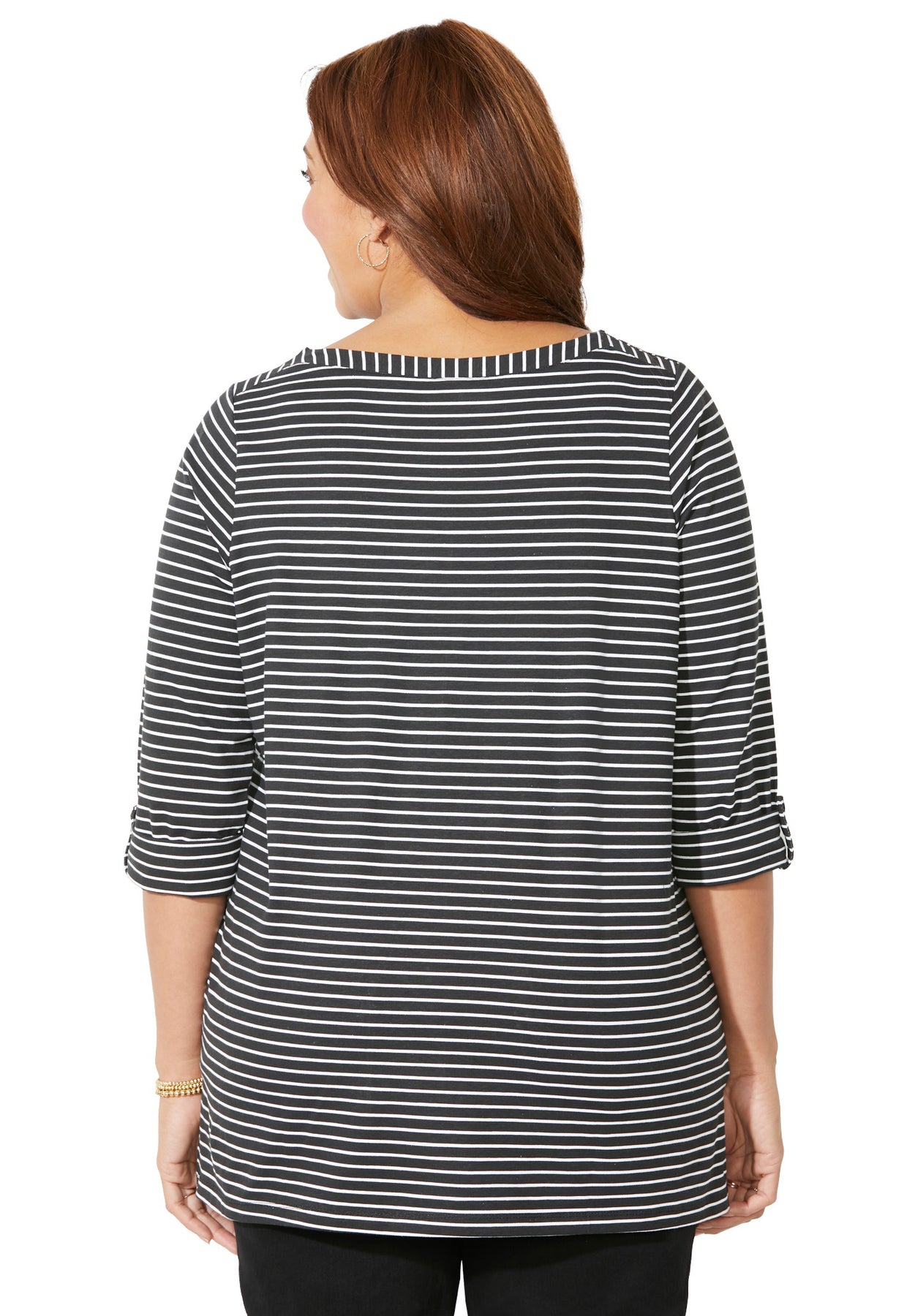 FIT: Relaxed and easy boatneck style in a smooth tunic length. 3/4 cuffed sleeves with decorative button tabs.