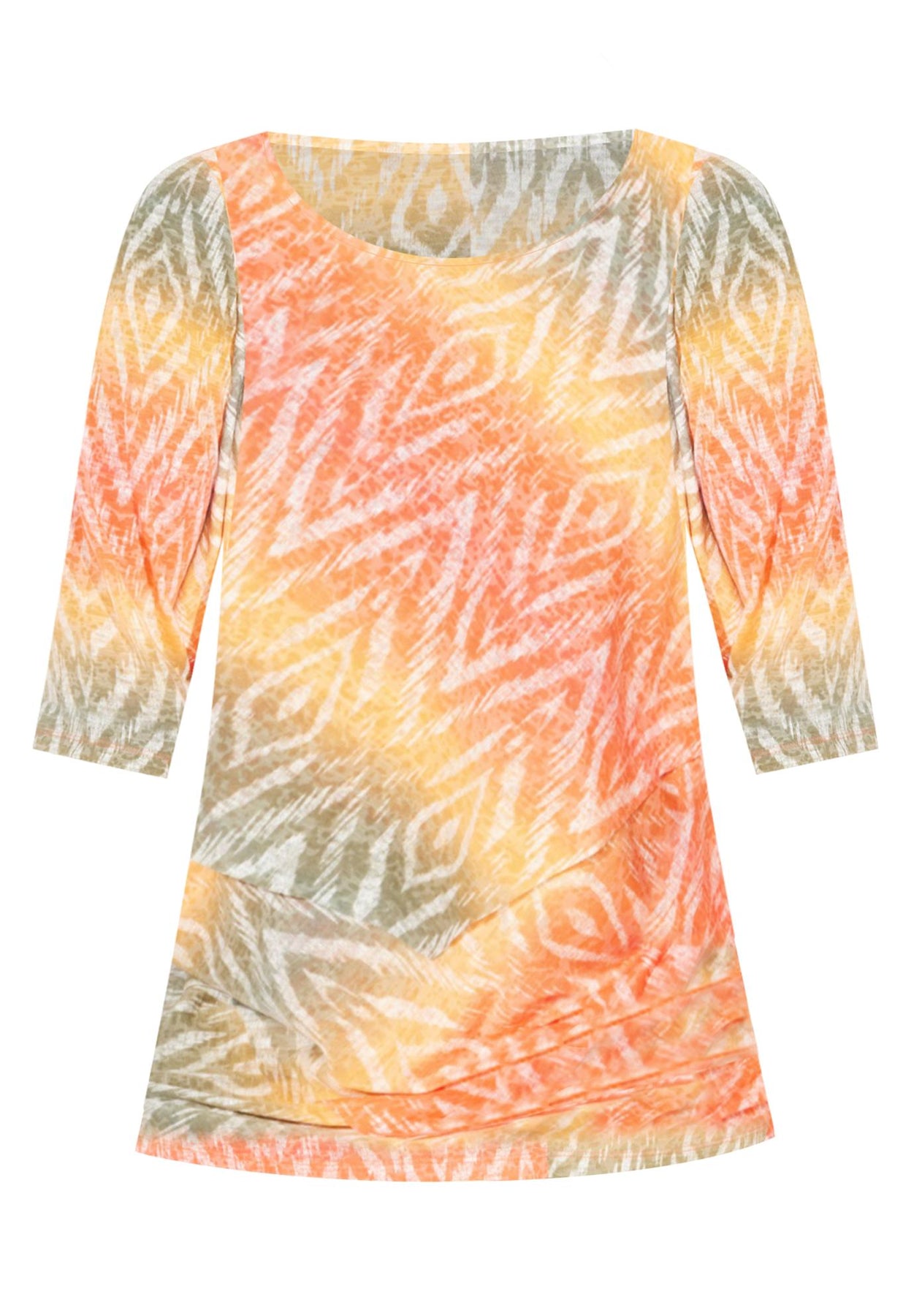 FIT: Relaxed, easy silhouette. Scoop neckline. 3/4 sleeves.