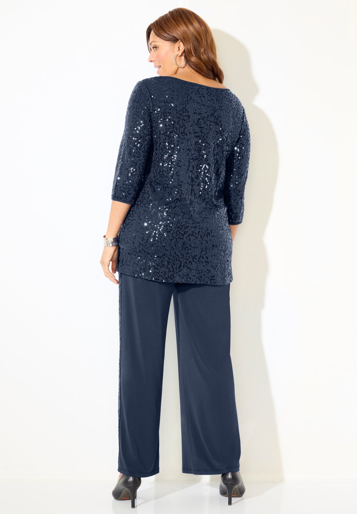 Stunning sequins give this tunic its sparkling personality. Soft interior lining for maximum comfort. The relaxed fit gracefully drapes the body, adding an effortless elegance. The face-framing V-neckline provides the perfect backdrop for any accessories you choose to wear with it. String of pearls, anyone?