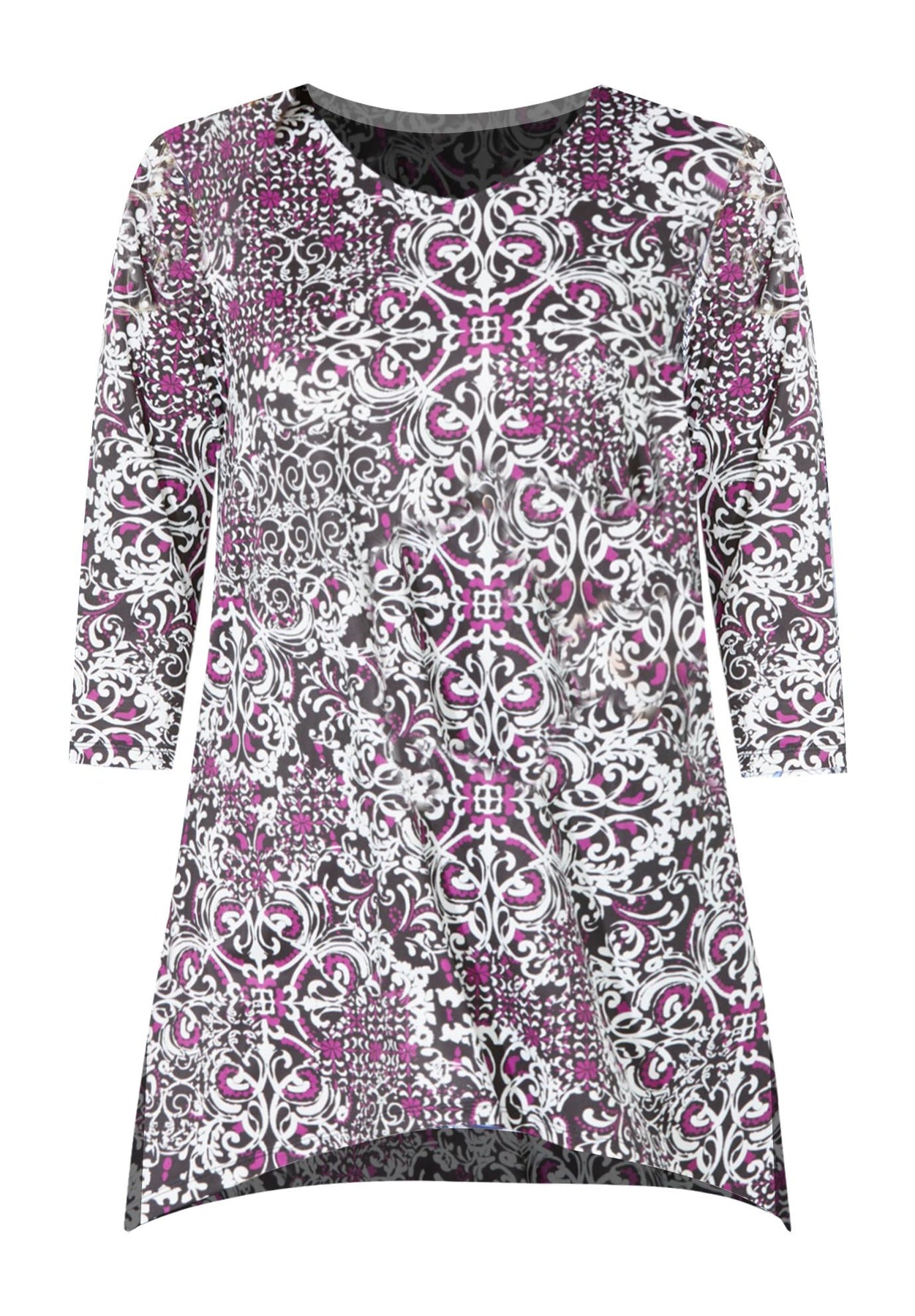 FIT: Relaxed and feminine tunic with an easy drape. V-neckline, 3/4 sleeves and slimming two-point hem with side slits.
