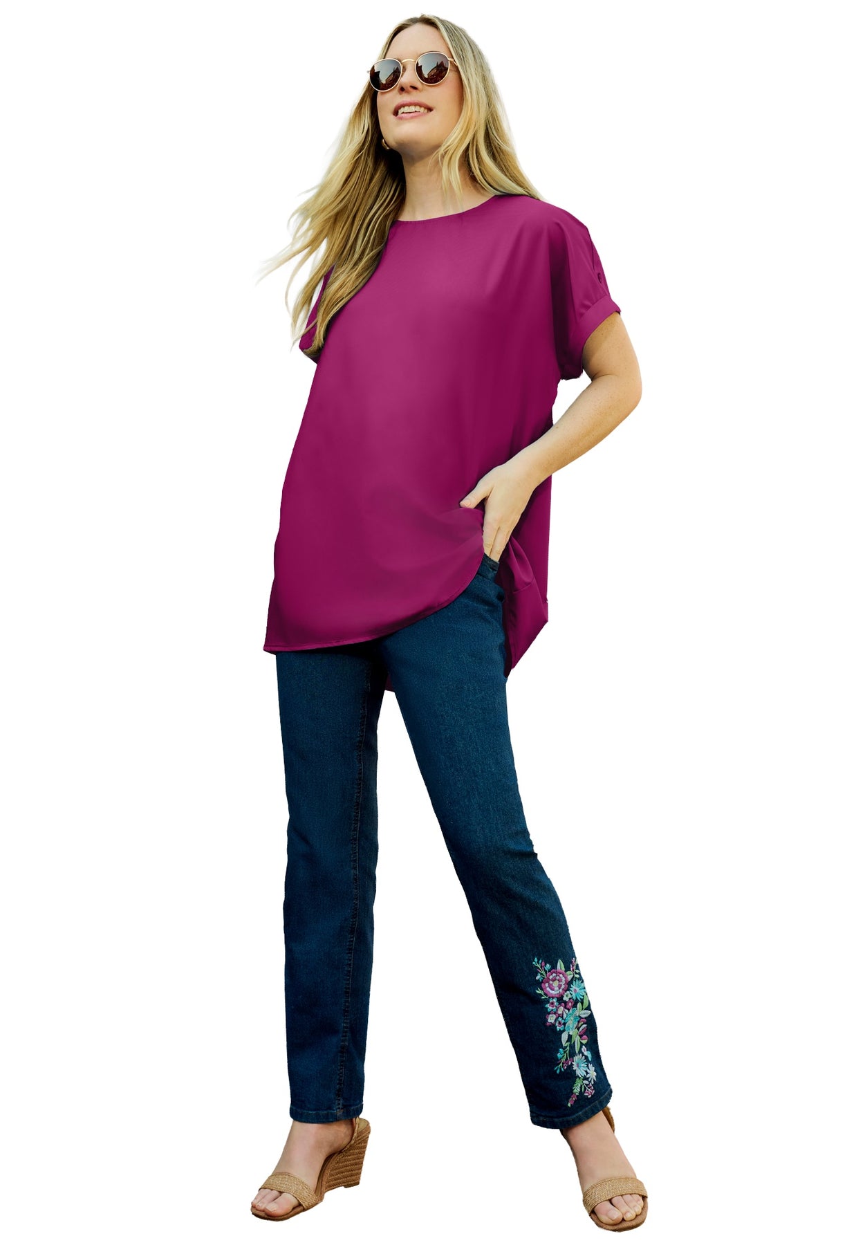Elevate your everyday wardrobe with this vibrant, plus size tee. Crafted from 100% poly fabric for a smooth lightweight feel that drapes beautifully. With its breezy silhouette and decorative button shoulder accents, this top blends comfort & style effortlessly.  Its perfect for workdays, weekends, & everything in between.