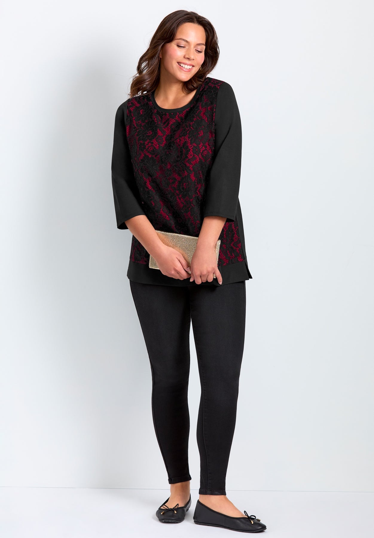 This top features a stylish lace overlay on the front for an elegant look. It has a classic scoop neckline and three-quarter sleeves, offering a comfortable yet polished silhouette. Perfect for dressing up your everyday wardrobe or adding flair to an evening outfit.
