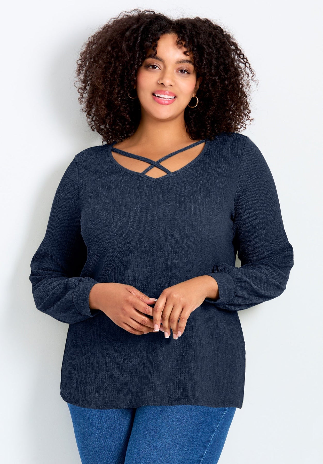 This long-sleeve top features a textured fabric and a stylish V-neckline with crisscross strap detailing. The gathered cuffs lend a subtle touch of volume to the sleeves, creating a polished yet playful look.