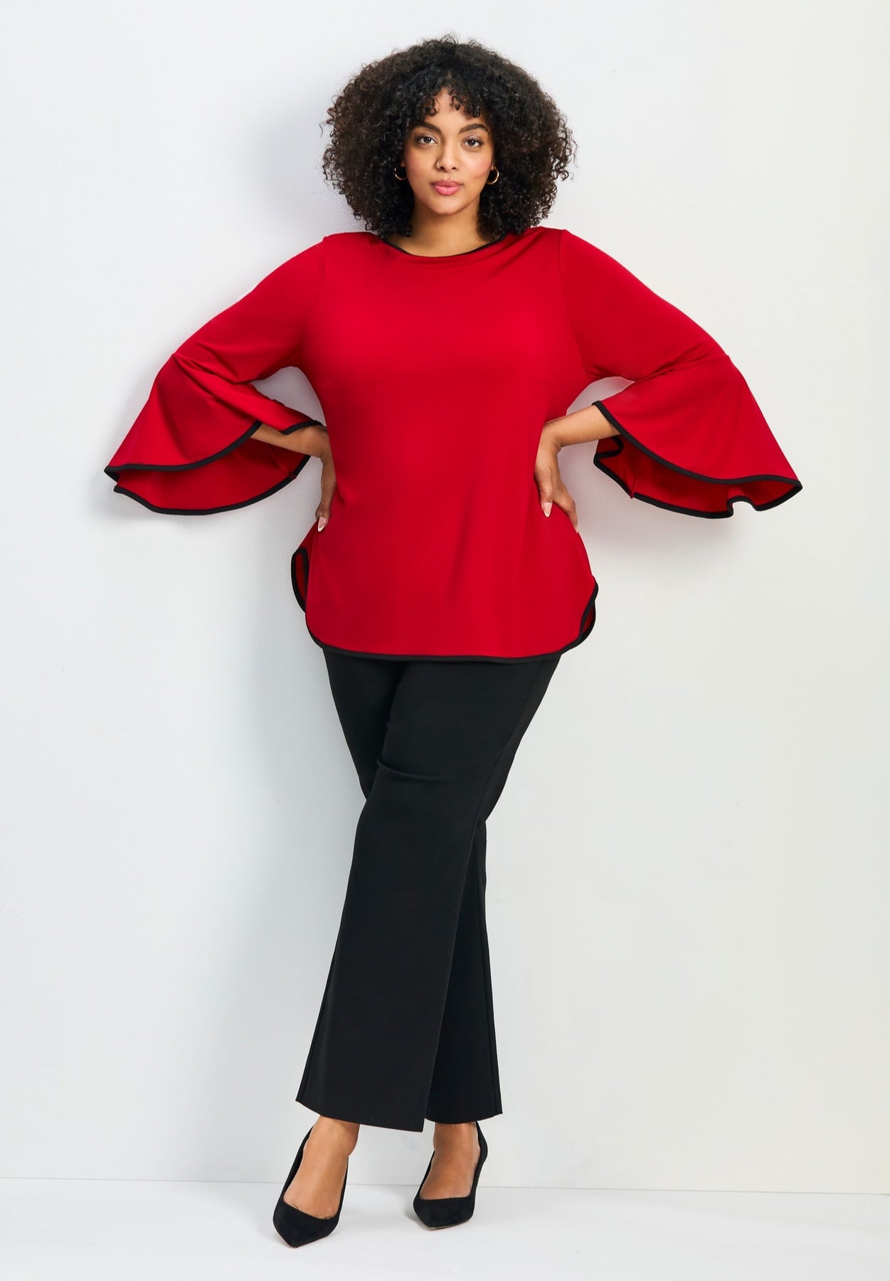 Introducing the Ivana Top, a must-have addition to your workwear lineup! This chic jersey top effortlessly combines style and sophistication with its elegant boat neckline and eye-catching contrast bind detail. Perfect for the modern professional, the Ivana Top's 3/4 bell sleeves add a playful twist to your office ensemble, ensuring you feel confident and fabulous all day long!