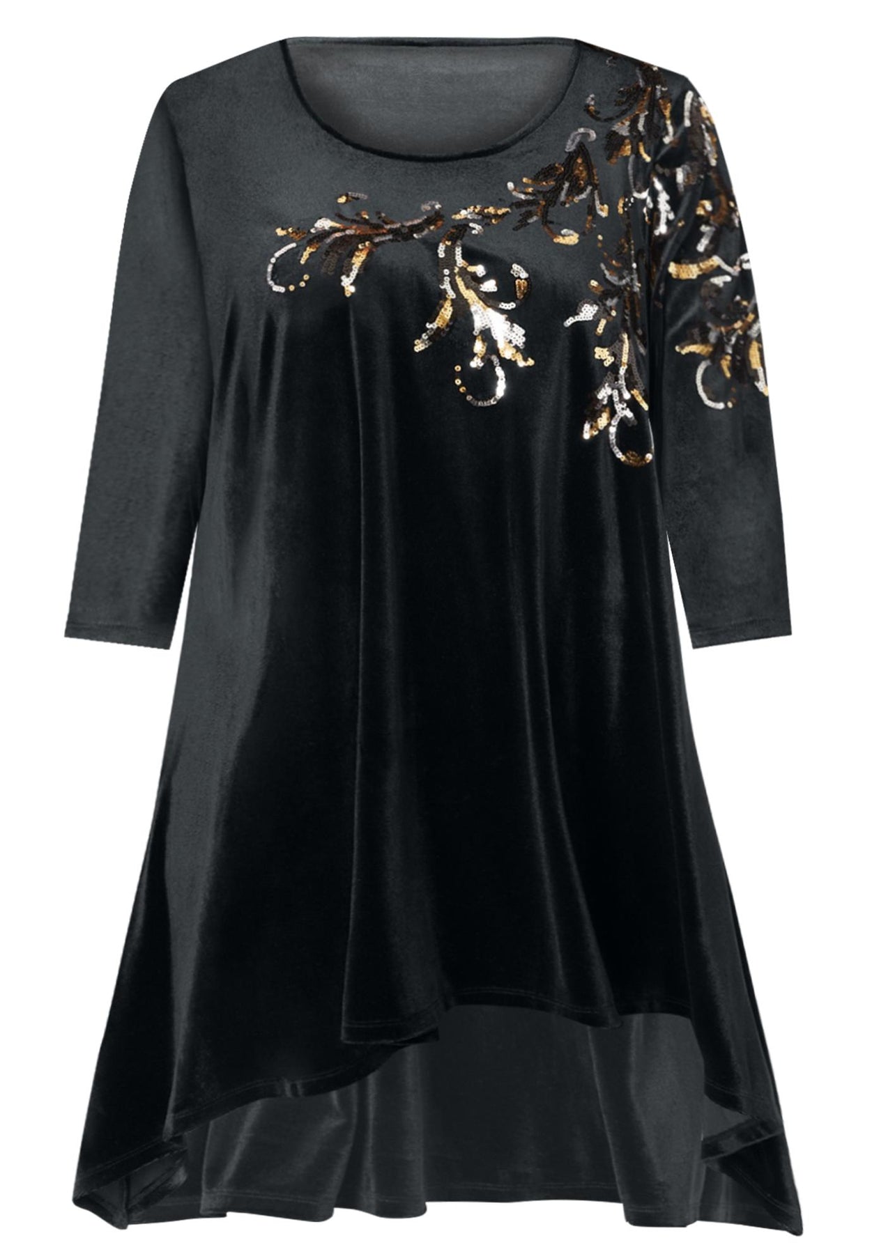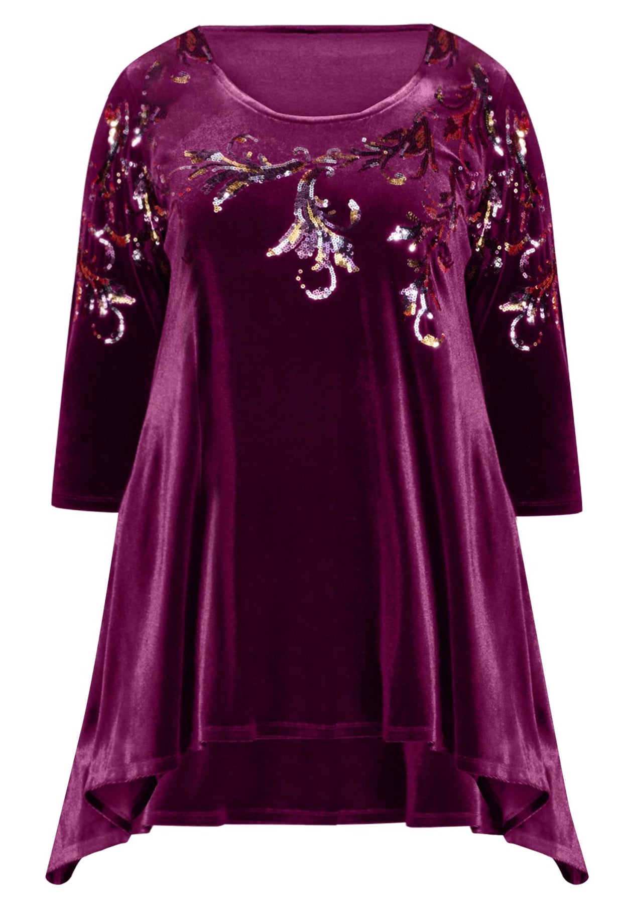 Sparkle a bit brighter at your next dinner party or friendly gathering with this A-line velour tunic and its striking sequins. Featuring three-quarter sleeves and a handkerchief hem, all eyes will be drawn to how the lovely sequin pattern shimmers against the rich velour fabric.