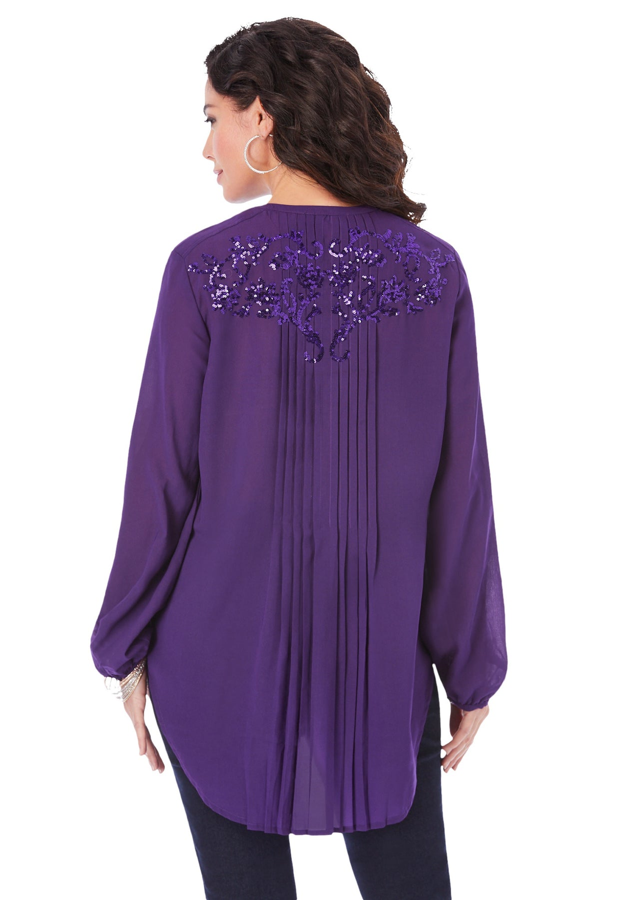 You'll dazzle in this sequin floral tunic that you can dress up or down. The flattering neckline and on-trend tunic length make this top a great addition to your closet. Relaxed fit, blouson sleeves, shirttail hem.