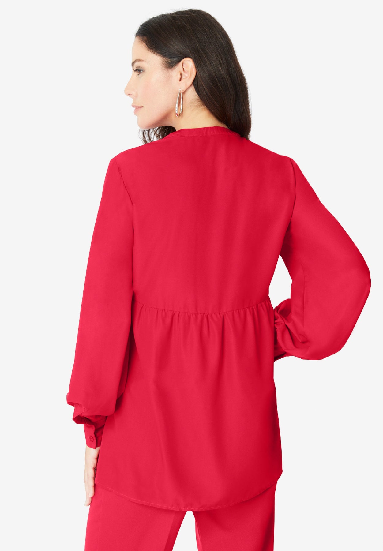 Nothing says 'holiday glam' quite like wearing the color of the season. Designed with a sequined lace panel across the chest, this flowy top is made from lightweight luxe crepe de chine fabric, making it the perfect piece to dress up or down. Notch neckline with half-button placket. Slight shirring at waistline. Button cuffs.
