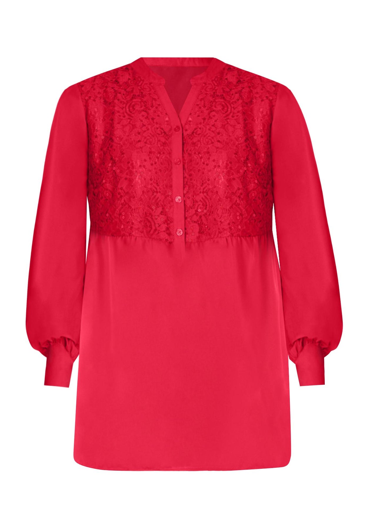 Nothing says 'holiday glam' quite like wearing the color of the season. Designed with a sequined lace panel across the chest, this flowy top is made from lightweight luxe crepe de chine fabric, making it the perfect piece to dress up or down. Notch neckline with half-button placket. Slight shirring at waistline. Button cuffs.