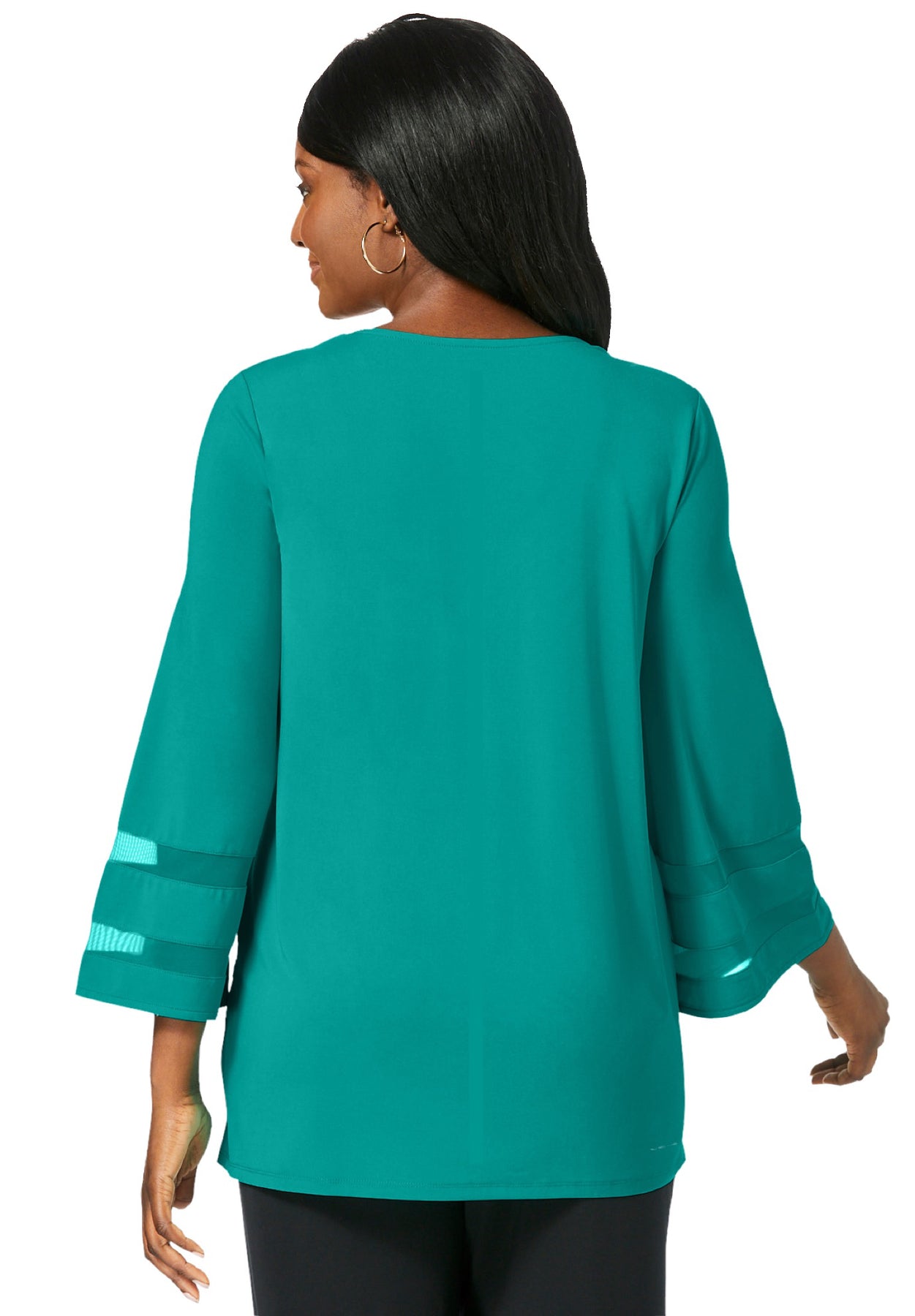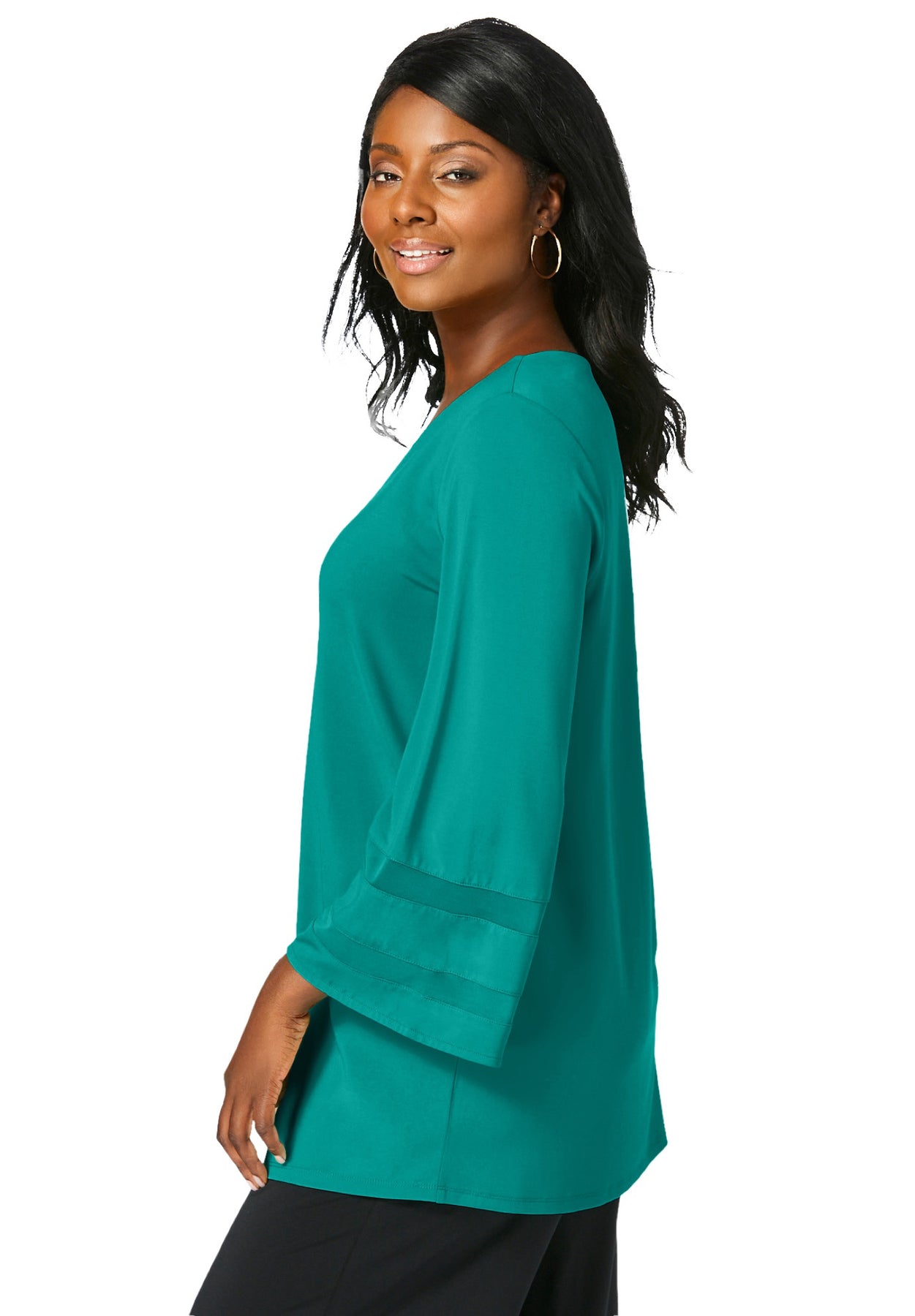 Mesh inset sleeve tunic. V-neckline; flattering A-line fit. The stretch jersey knit drapes beautifully, keeps its smooth shape wash after wash, and packs without wrinkling.