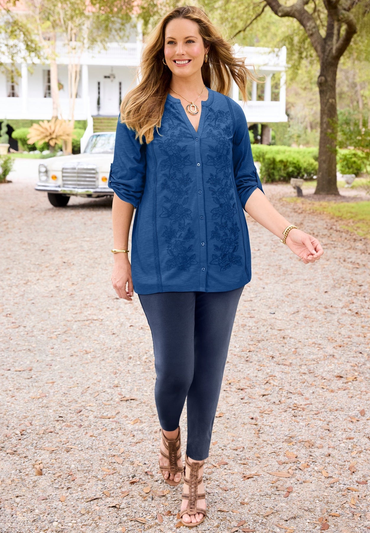 Effortless and charming, this ultra-soft jersey tunic features tonal embroidery and intricate crochet detail along the buttonfront placket. Long sleeves easily roll to a 3/4 length with functional button tabs. Featuring a relaxed silhouette, this tunic can be worn fastened as a buttondown top or open with our Suprema® tank underneath.