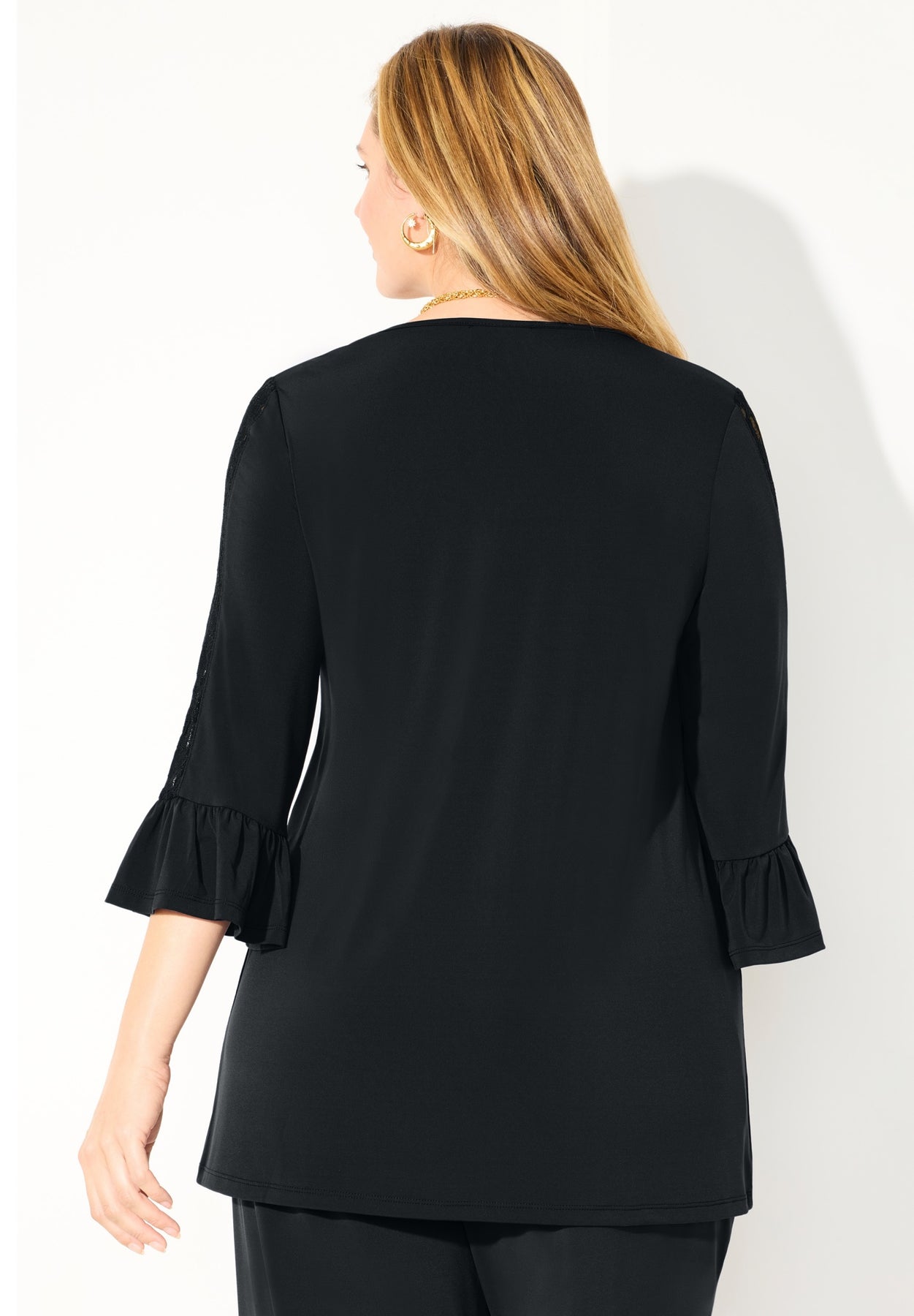 Embrace the three S’s: soft, stretchy, and stylish. This relaxed V-neck top stands out with 3/4 length sleeves featuring delicate lace insets and flounce cuffs. Dress this top up with tailored pants or keep it casual with jeans for an effortlessly chic look.