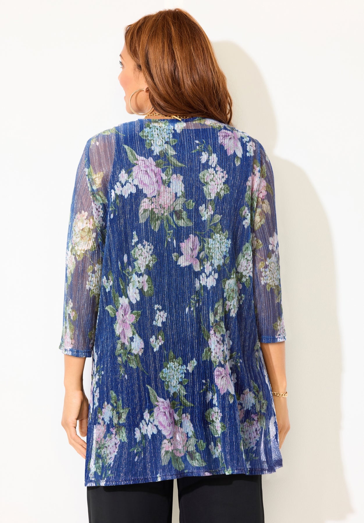 Stunning shimmer creates this cardigan & tank set’s show-stopping style. Designed with an easy, flowy silhouette that graces the figure beautifully. Pairs wonderfully with our Crepe Knit Pull-On Pant.