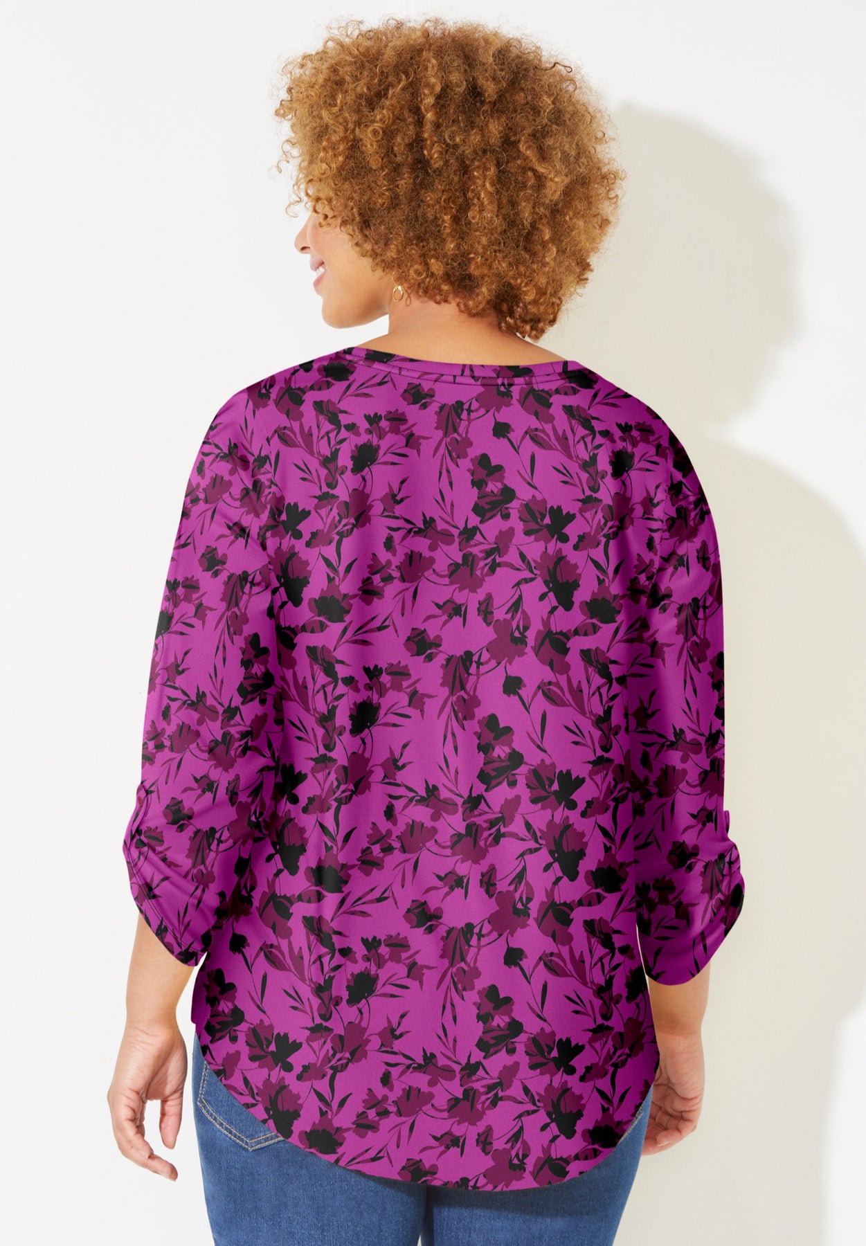 FIT: Relaxed and easy fit. V-neckline. Long sleeves can be converted to 3/4 roll-tab sleeves.