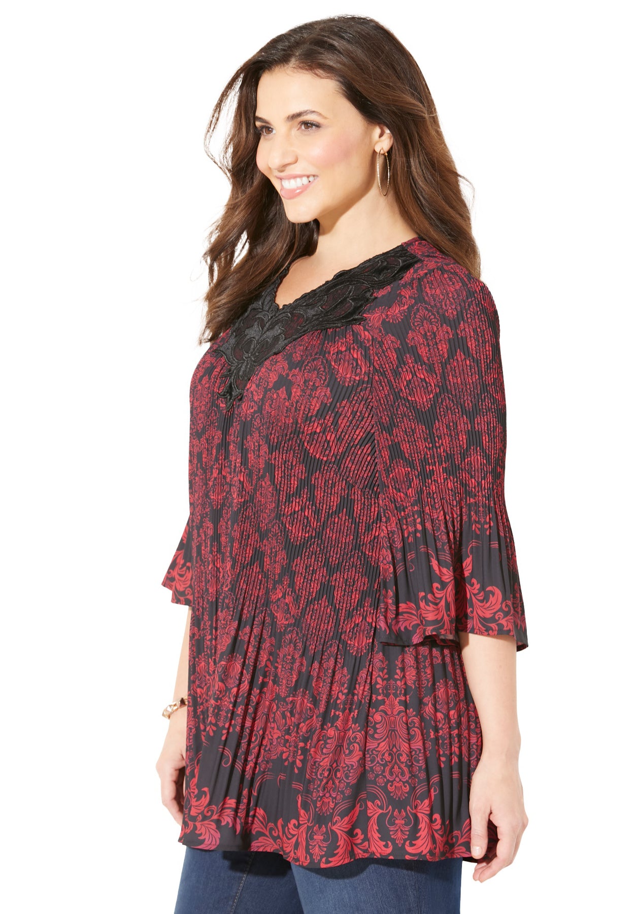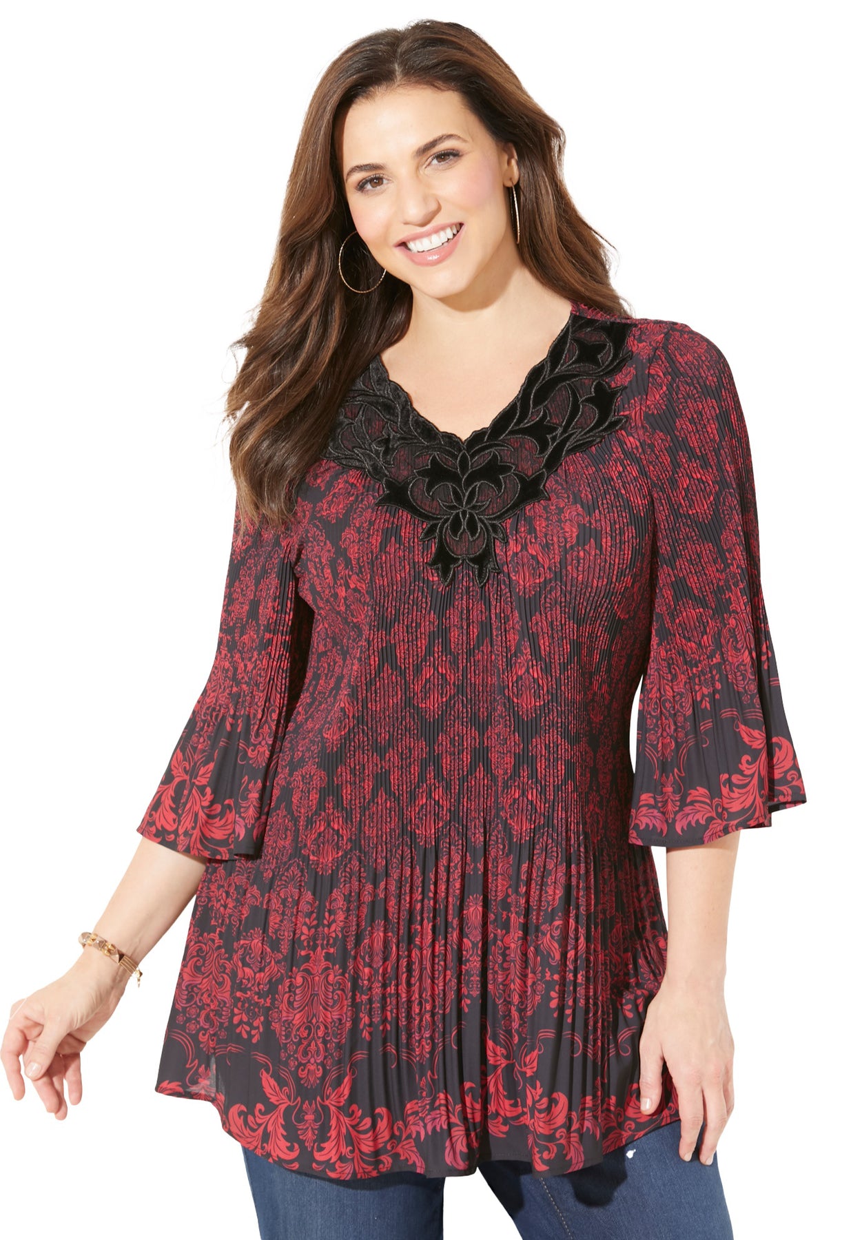 FIT: Relaxed, yet refined. Soft, forgiving pleats float over your curves for ultimate comfort. Velvet applique at the V-neckline. 3/4 angel sleeves. Tunic length.