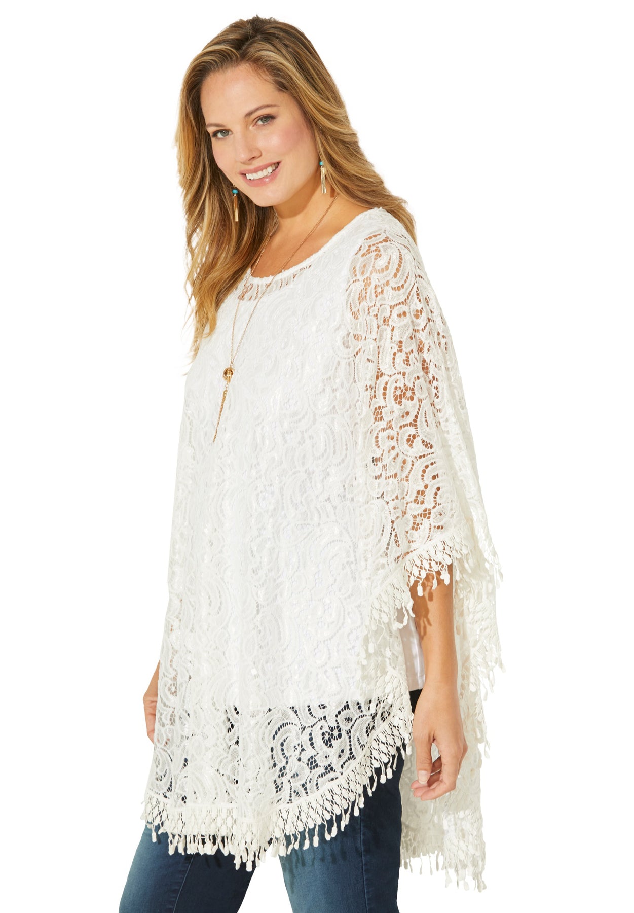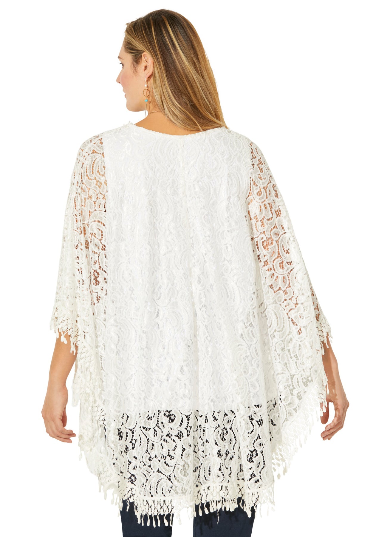 This lovely lace poncho is designed for dressier moments, but so comfortable you'll look for many ways to wear it. Crafted from soft stretch lace that feels as good as it looks. Layers beautifully with pieces from our AnyWear linen and lace collection or back to our Suprema Built Up Tank.