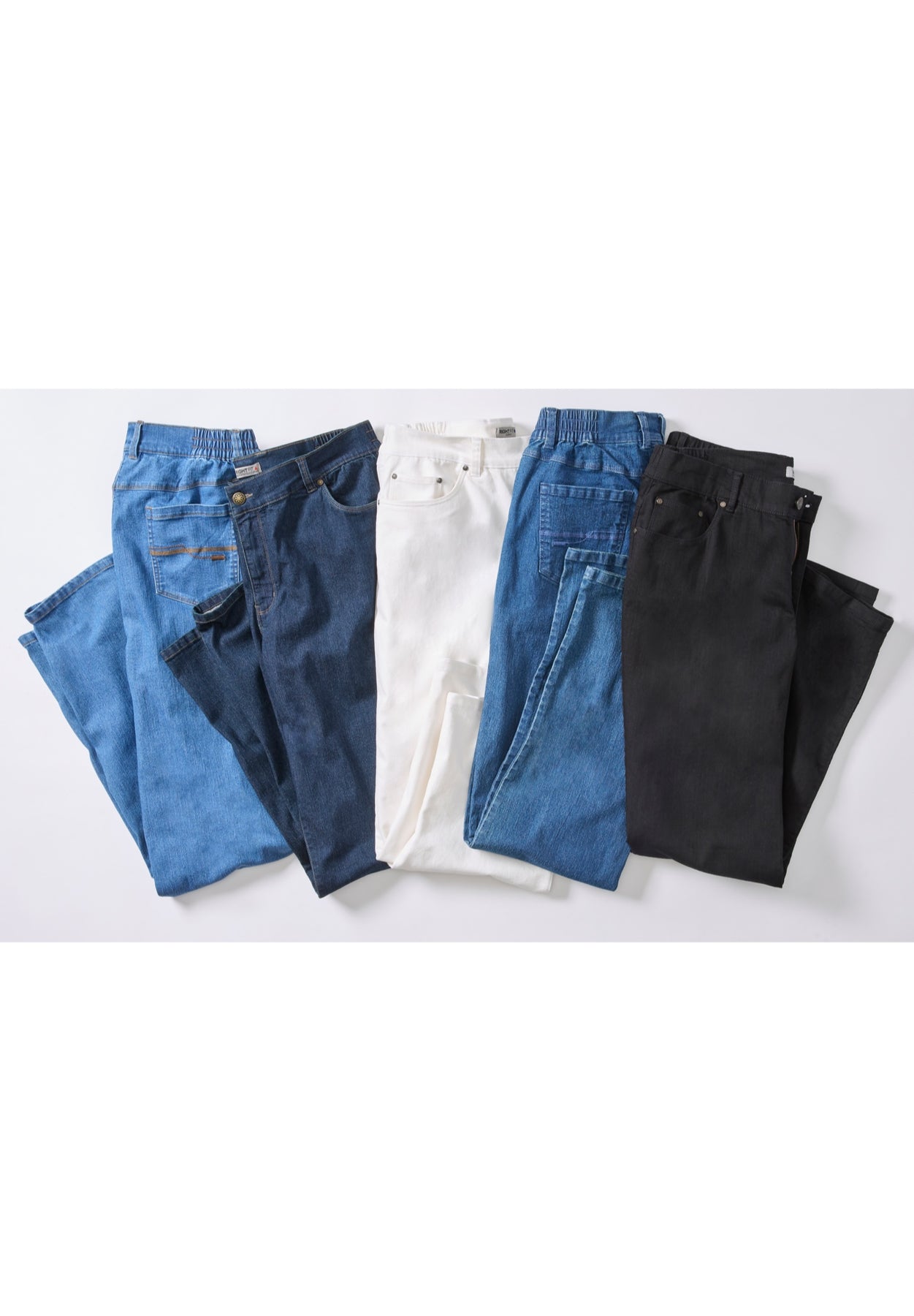 FIT: A slimming style for those who are fullest at the hips. Relaxed fit that smooths comfortably from waist to hip. Zip fly with button closure. Elastic stretch on sides of waist. Classic 5-pockets. Straight leg.