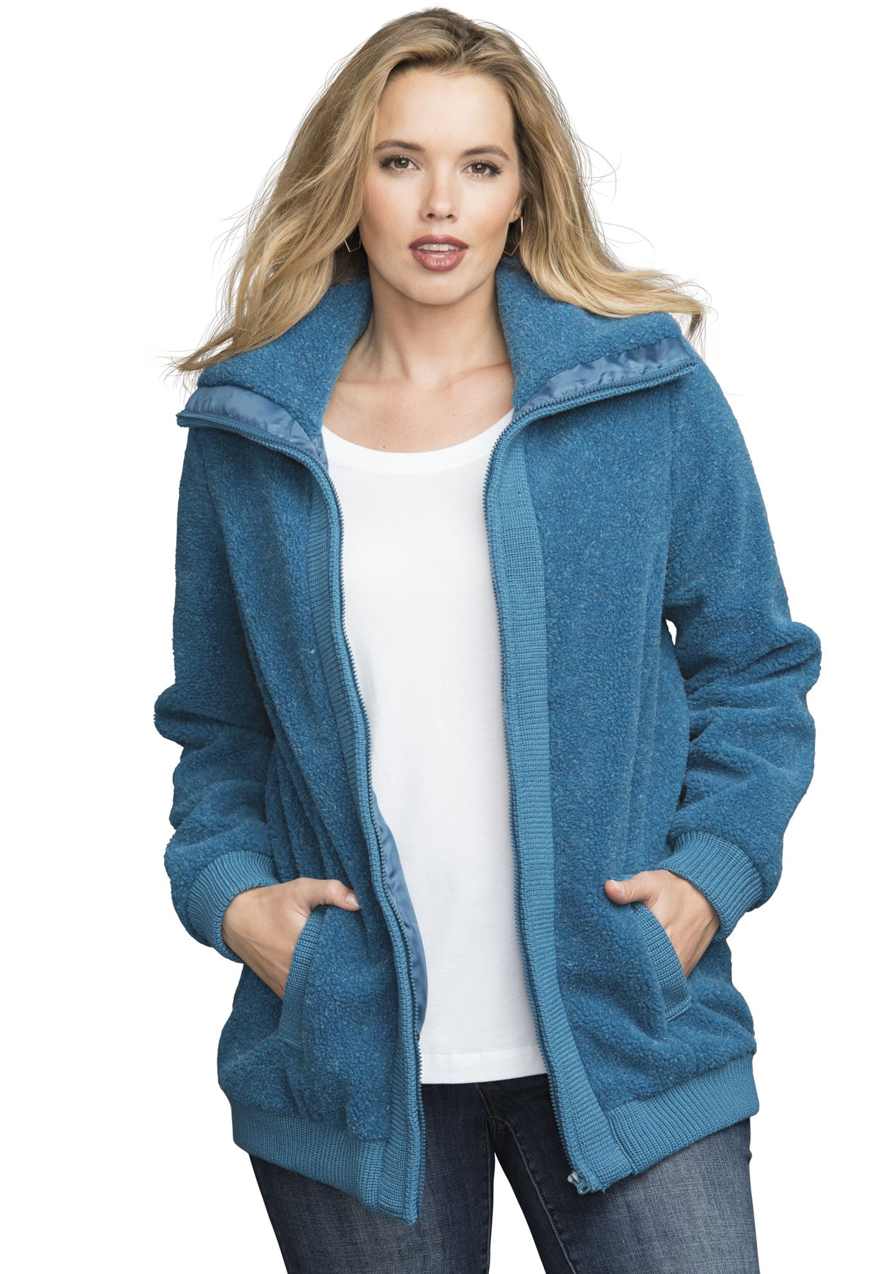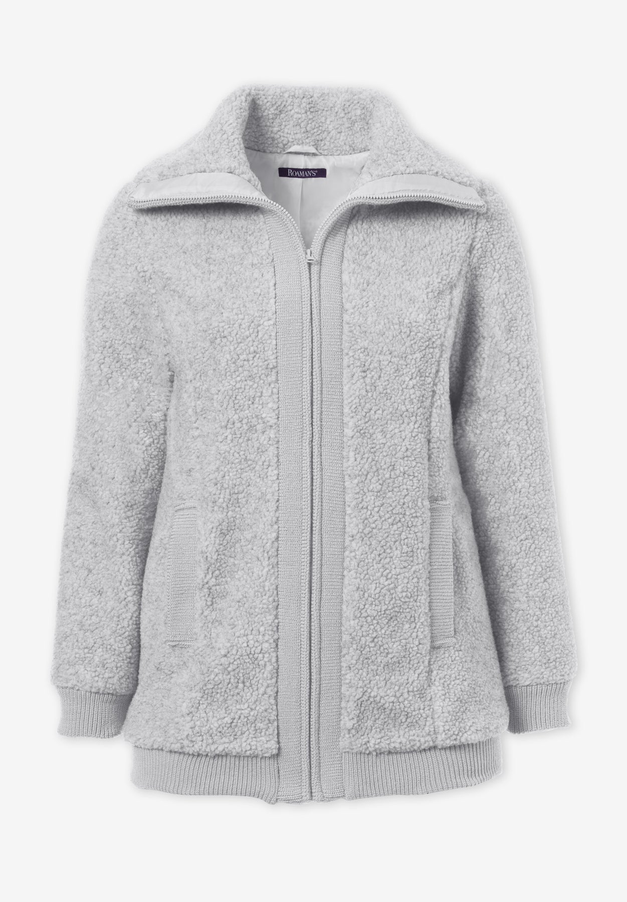Textured fleece and ribbed trim make this high-collar bomber a cozy-cool choice for chilly weather. Where fashion meets function, perfect for fall or winter. With zip front closure and welt pockets.