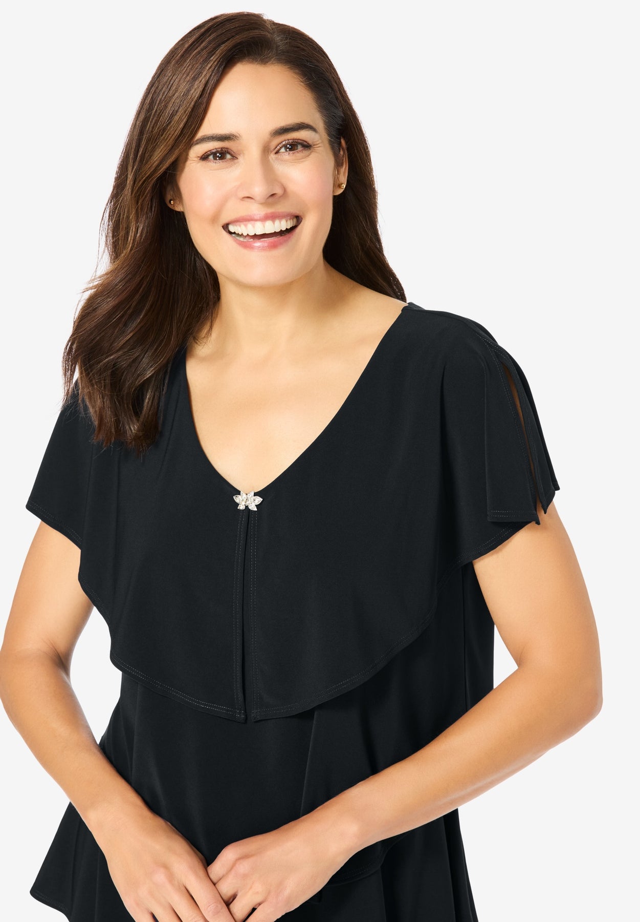 This pant set is sure to be a showstopper! Beautiful tiered set that dresses up your look for any occasion. Top has v-neckline with tiered ruffles. Straight-leg pant.