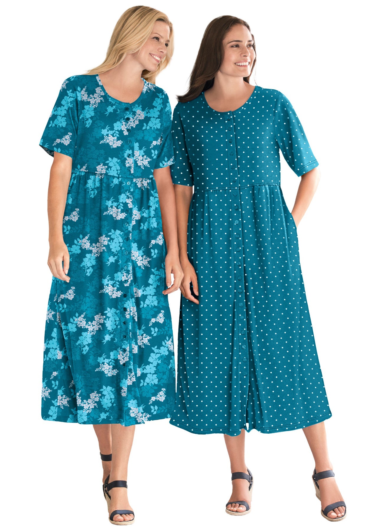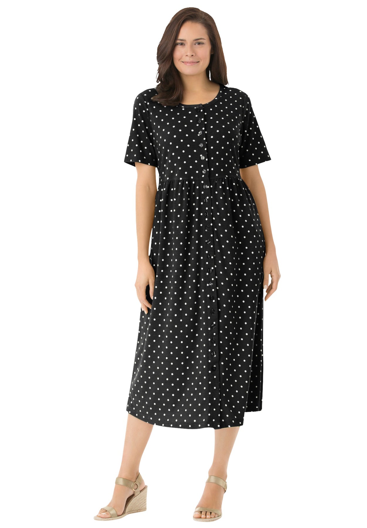 Woman Within Women’s Plus Size Button-Front Elbow-Sleeve Knit Dress is designed for a flattering, reliable fit you’ll wear on repeat. Crafted from soft, breathable knit with comfortable stretch, it drapes smoothly without clinging. The button-front bodice and a gently gathered empire waist that hits right below the bust creates shape without bulk, while elbow-length sleeves and a full mid-calf skirt offer balanced coverage and easy movement. Finished with side-seam pockets and durable stitching for lasting wear, it’s an effortless, polished style. Available in Average, Petite, and Petite Short lengths—find your perfect fit and don’t stop at one.