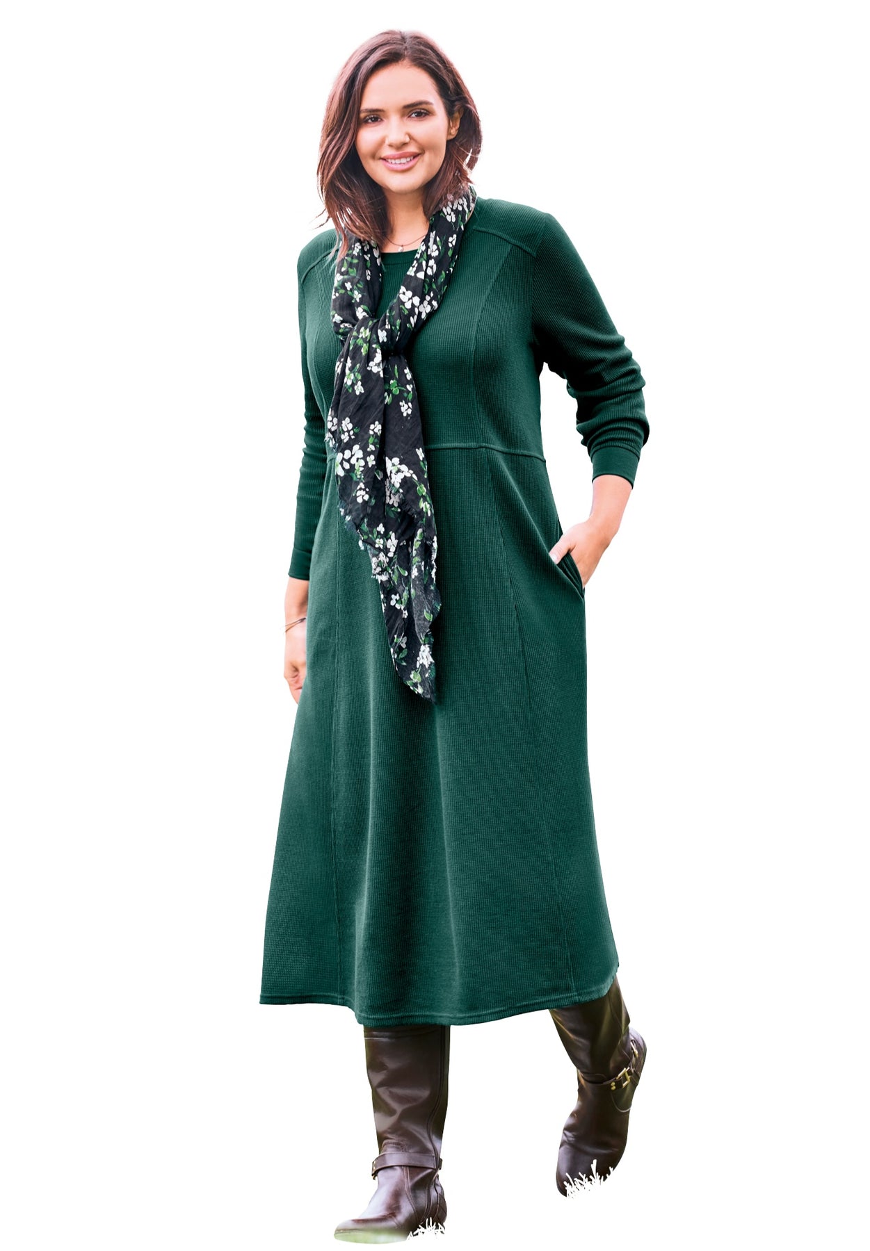 This textured thermal dress with an empire waist designed with feminine princess seams. The roomy A-line silhouette offers a cling-free fit for total comfort.