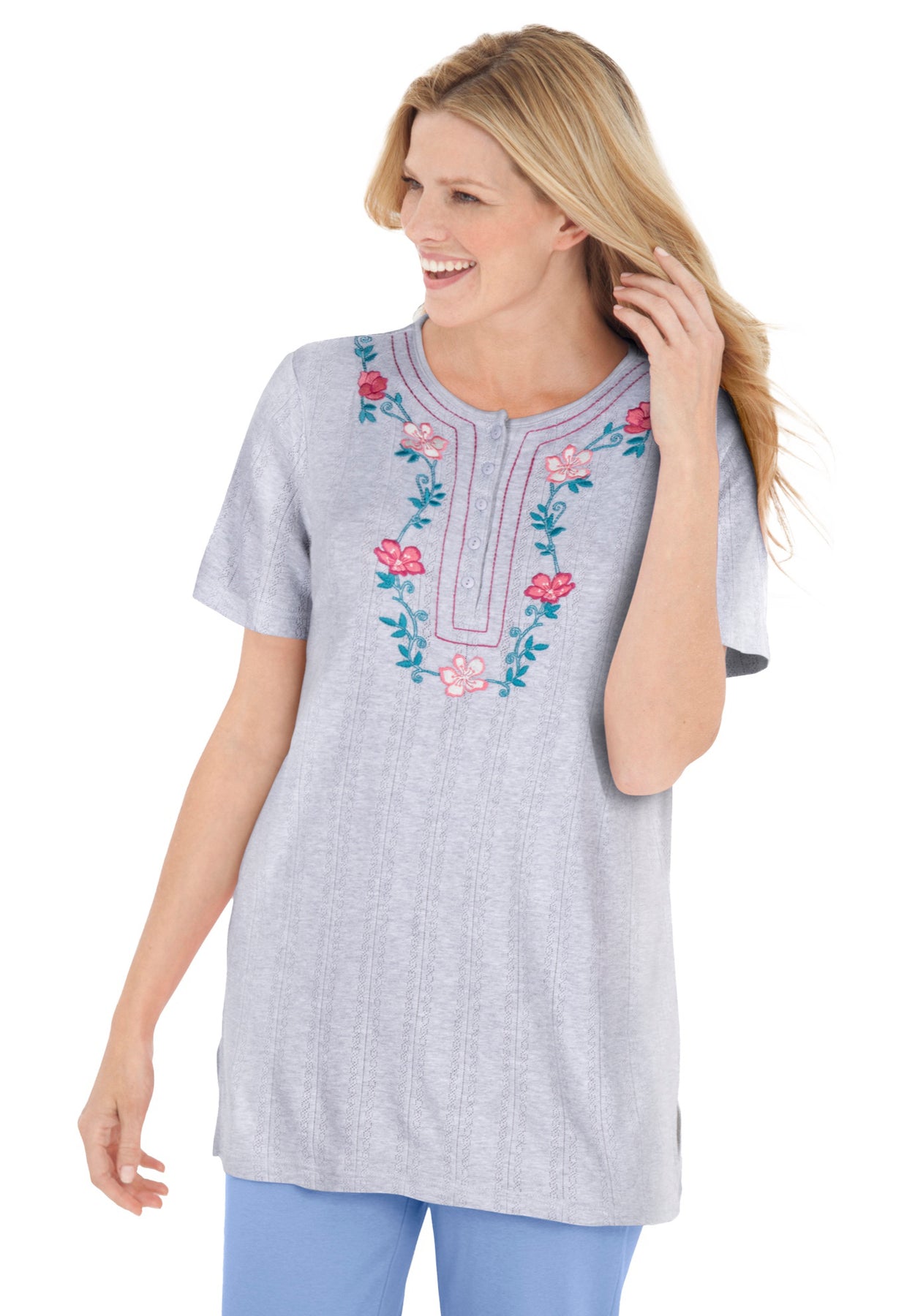 A light and airy pointelle knit is embroidered with a pretty floral design around the Henley neck. Cut in a relaxed fit, the short sleeves and buttoned front adds to the relaxed airiness. Pair this lovely piece with something soft and lightweight.