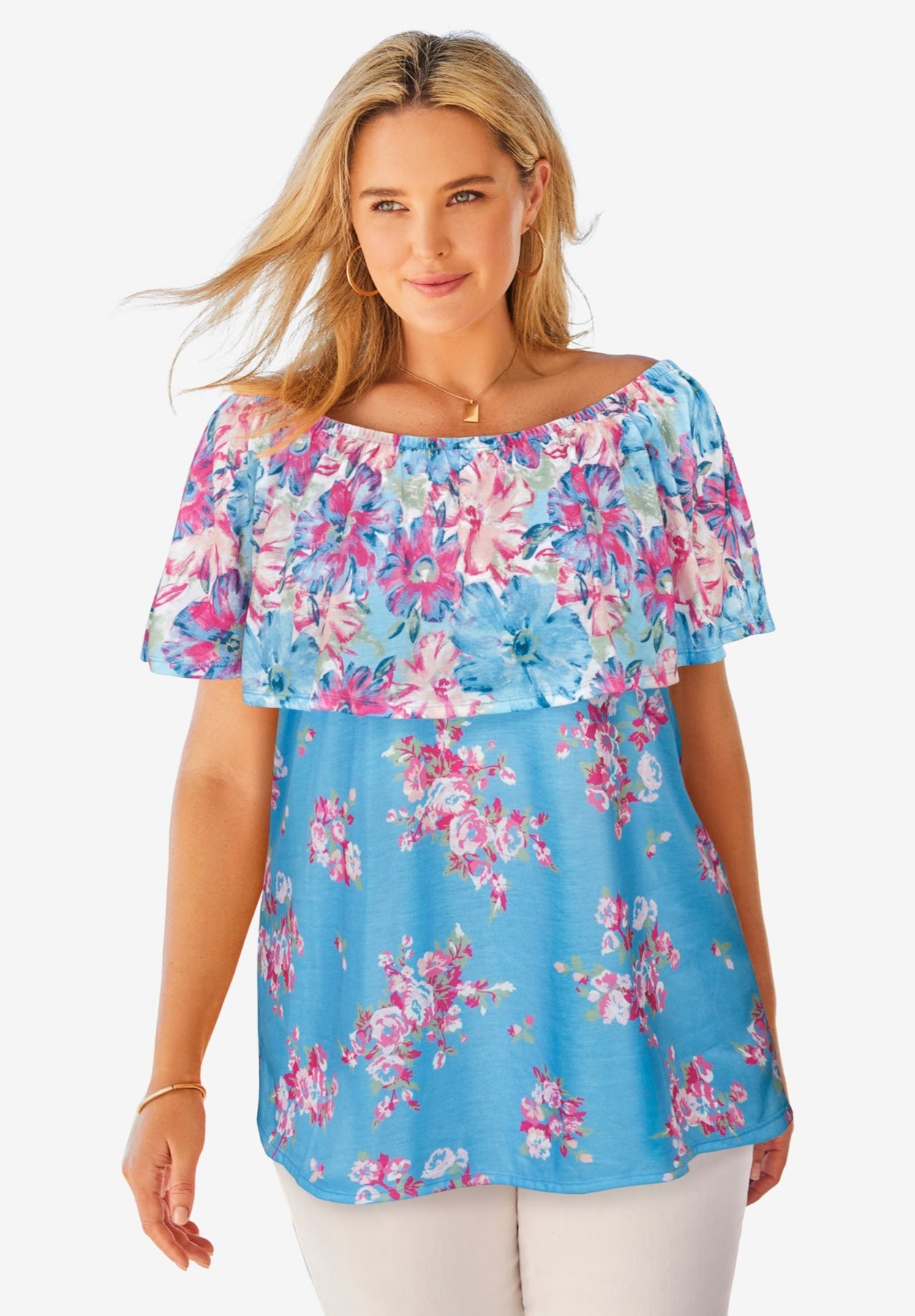 - Elasticized neckline offers the option to wear on or off the shoulders, giving you two looks in one.