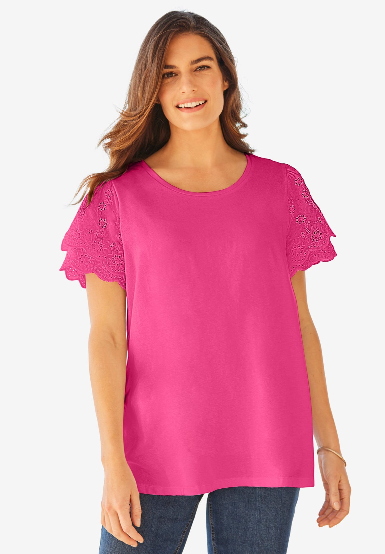 Sunny days call for our Eyelet Ruffle Tee that features delicate flutter sleeves and pretty eyelet details and scallop edge. Stock up on our gorgeous color and light up your day!