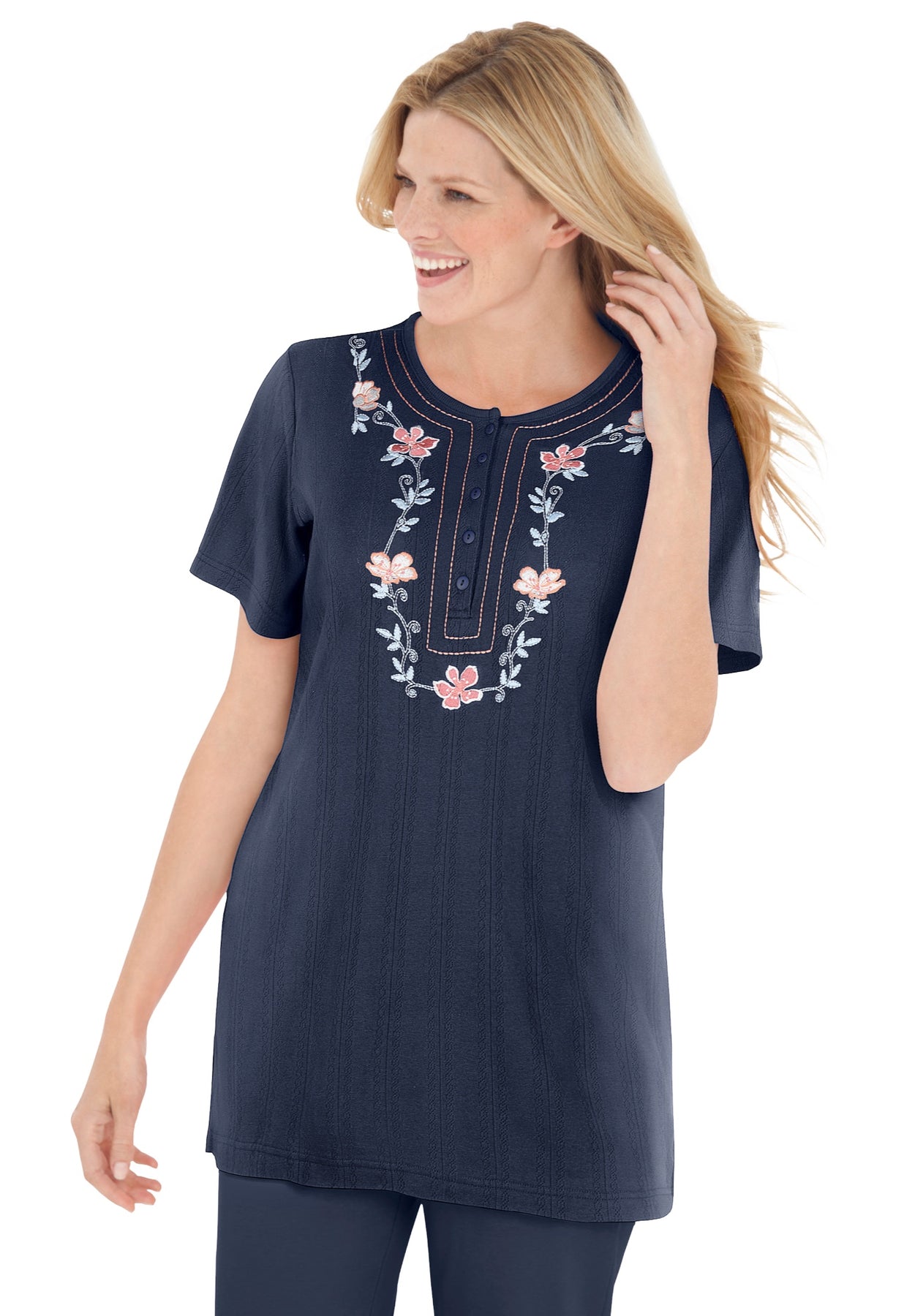 - Beautifully embroidered floral design enhances the Henley neckline for a sophisticated touch.