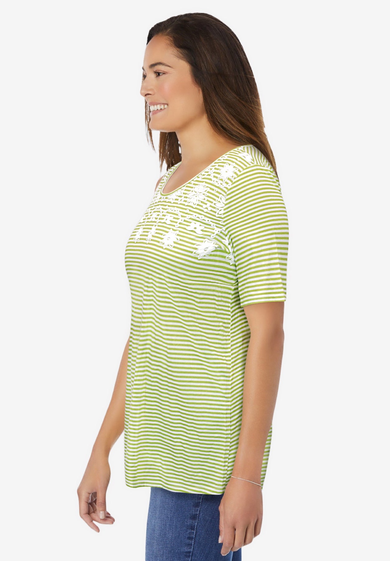 A great pop of color for your wardrobe. Scoop neckline with raised floral details. Elbow length sleeves. A-line silhouette. Straight hem.