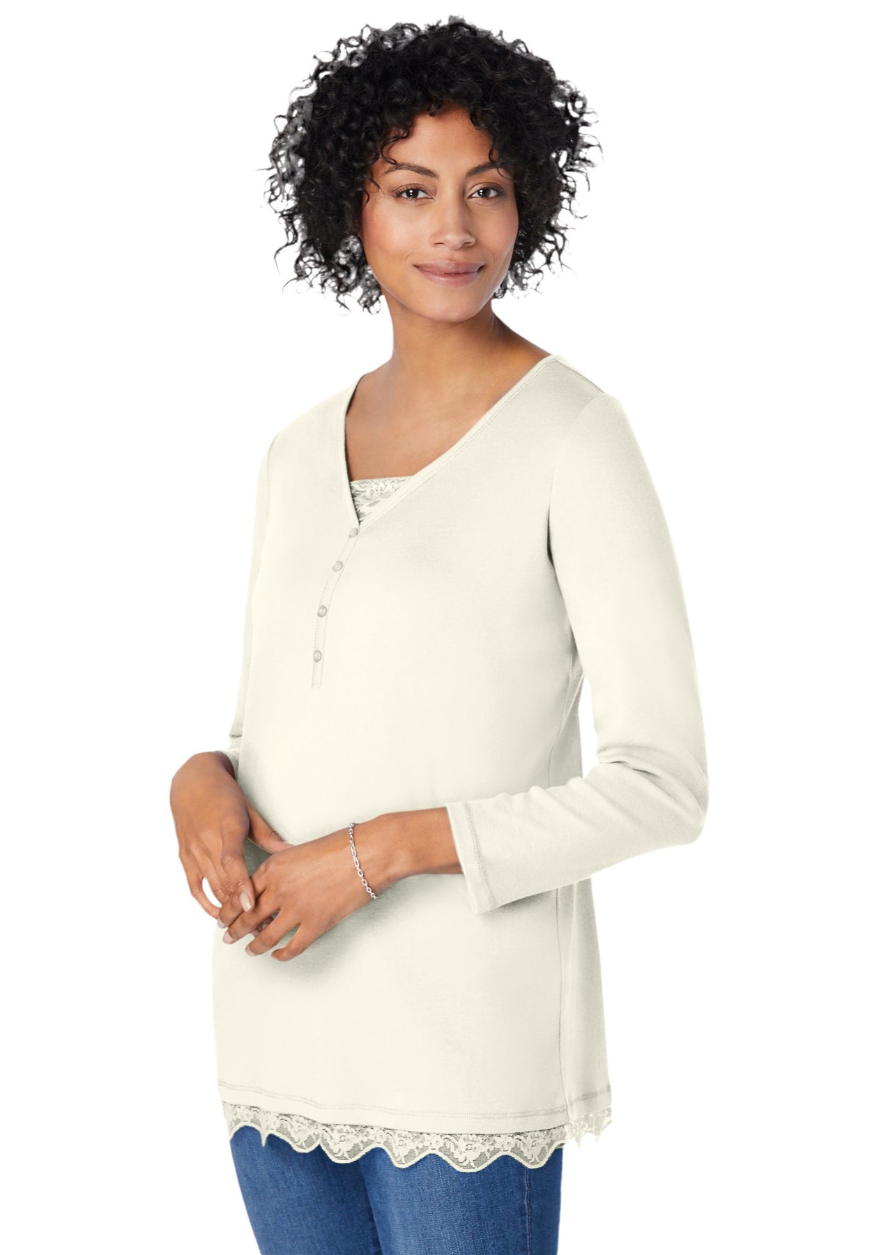 Soft and casual with pretty lace detailing. V-neck Henley button placket with lace insert for a layered look.