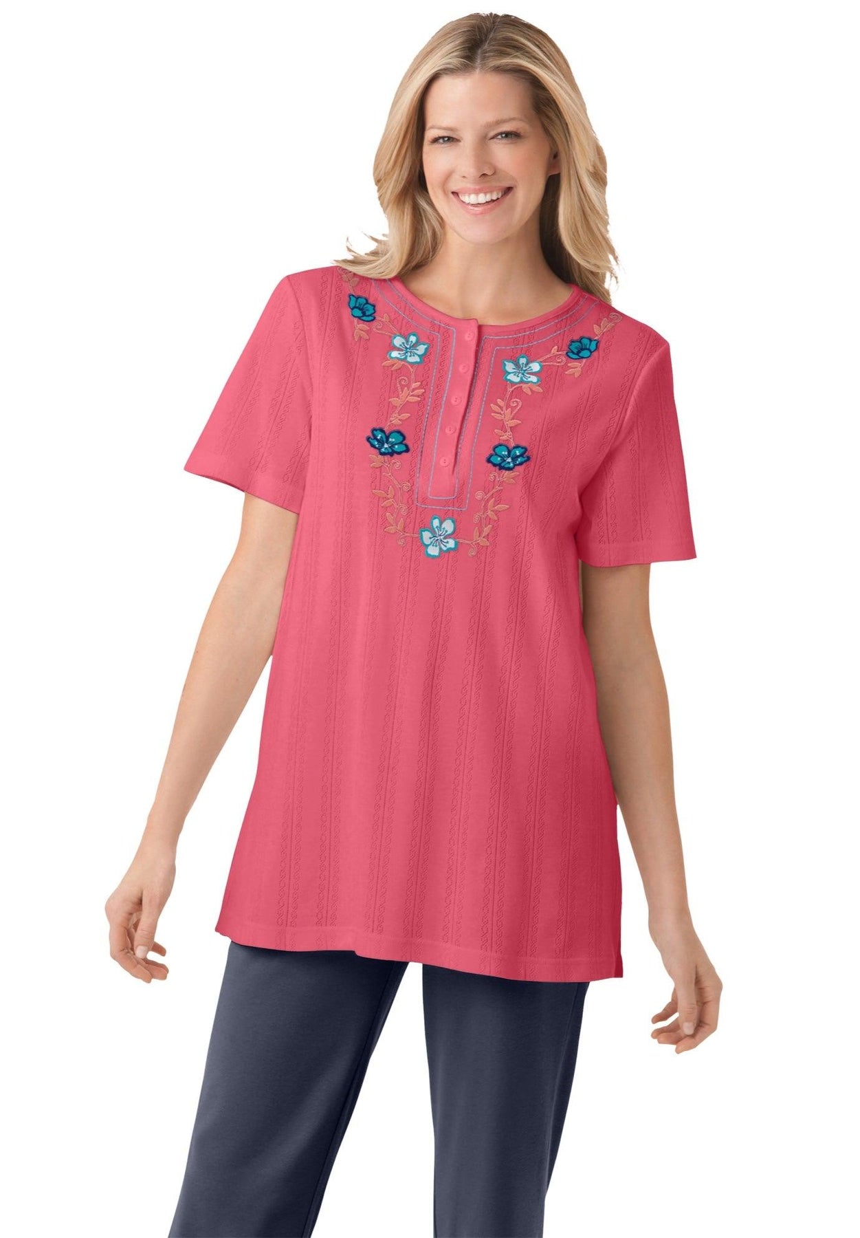 A light and airy pointelle knit is embroidered with a pretty floral design around the Henley neck. Cut in a relaxed fit, the short sleeves and buttoned front adds to the relaxed airiness. Pair this lovely piece with something soft and lightweight.